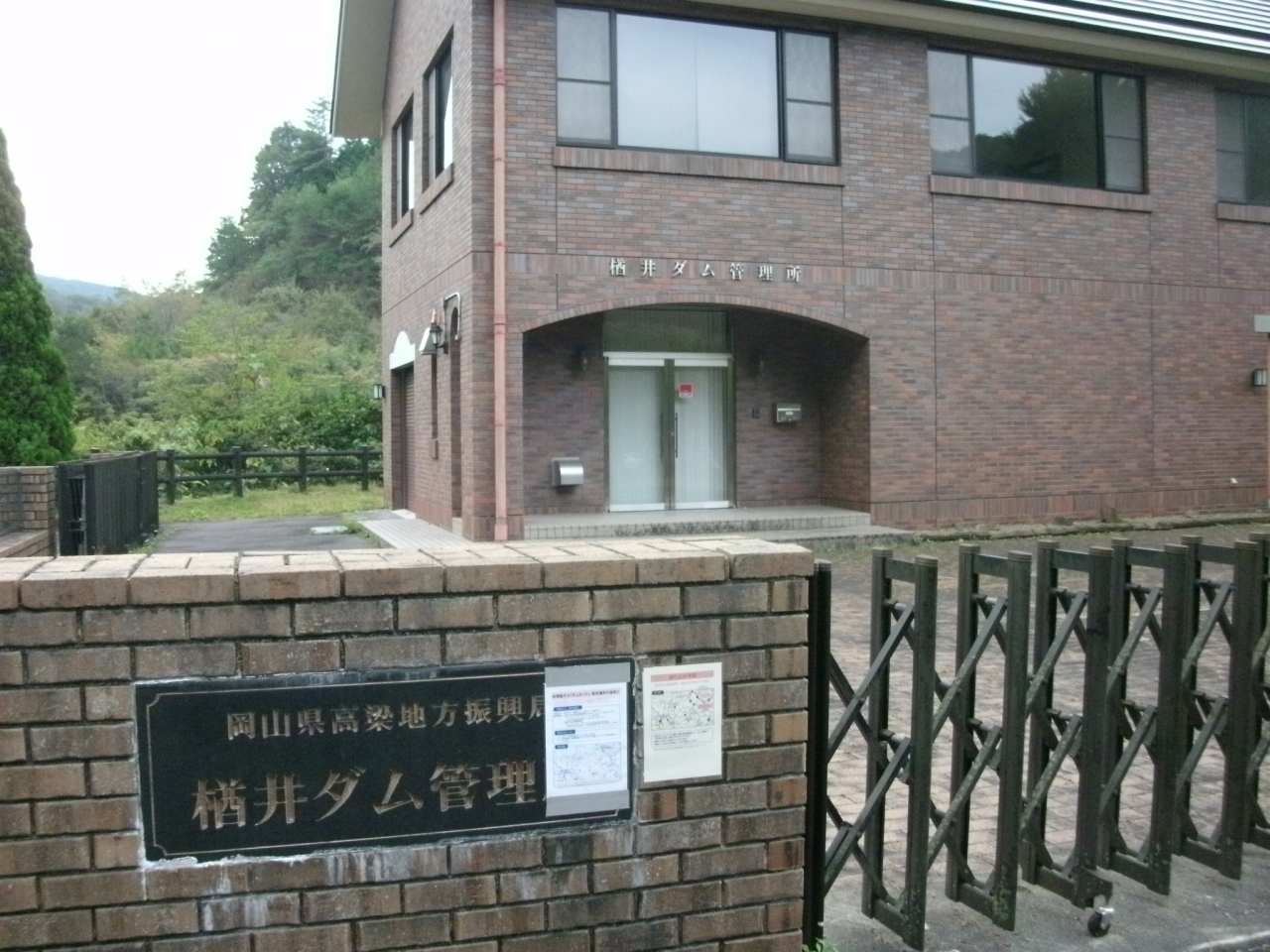 ダムサイト左岸にある管理所は教会風のデザインになっていてちょっと面白い。訪れたのが日曜日だったので管理所は無人になっていて、門扉にダムカード配布についての表示(添付写真を参照ください)があったので、それに従って“旭川ダム統合管理事務所”に出向き、楢井ダムを訪れた証拠写真を提示してダムカードを頂くことができました。