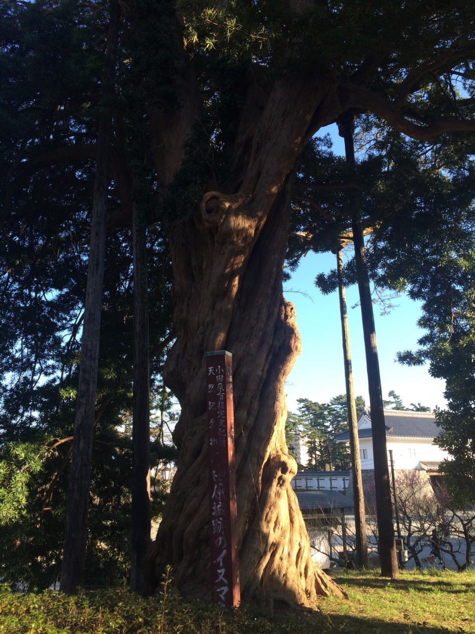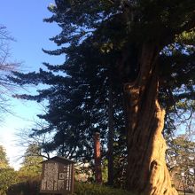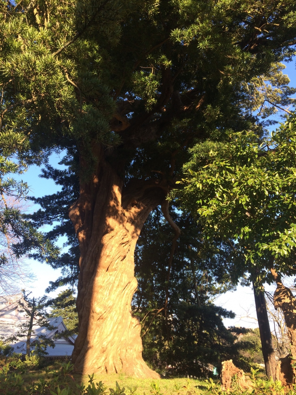 関東南部の海岸地帯の森林に多く自生する高い木で小田原市内の寺や神社の境内に多くあります。天守閣に向かう道の少し逸れたところにありますが高い木で目立つので見逃さないと思います。木の廻りは柵で囲まれ高く巨木です。屋久島の屋久杉を思い出しました。樹齢はかなり古そうな木でした。
