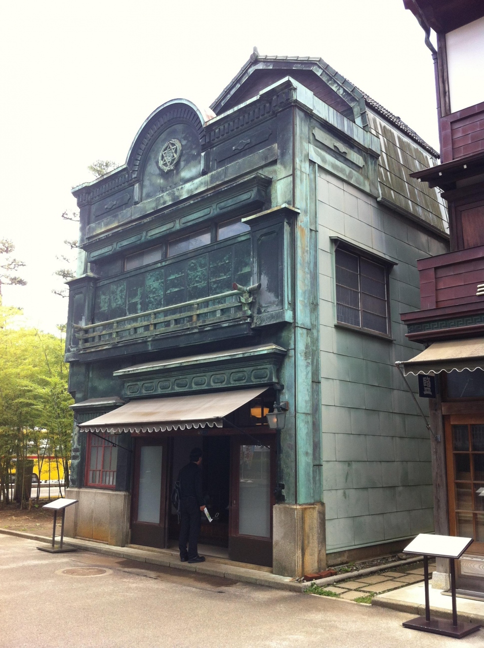 銅の緑青色が効いている看板建築 すばらしい