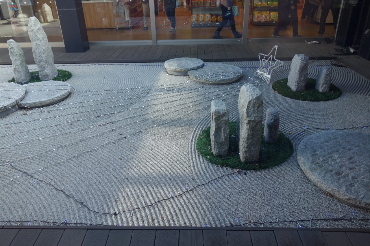 売店では、茨城らしく納豆の品揃えが充実(笑)。中庭にはなぜか枯山水があります。