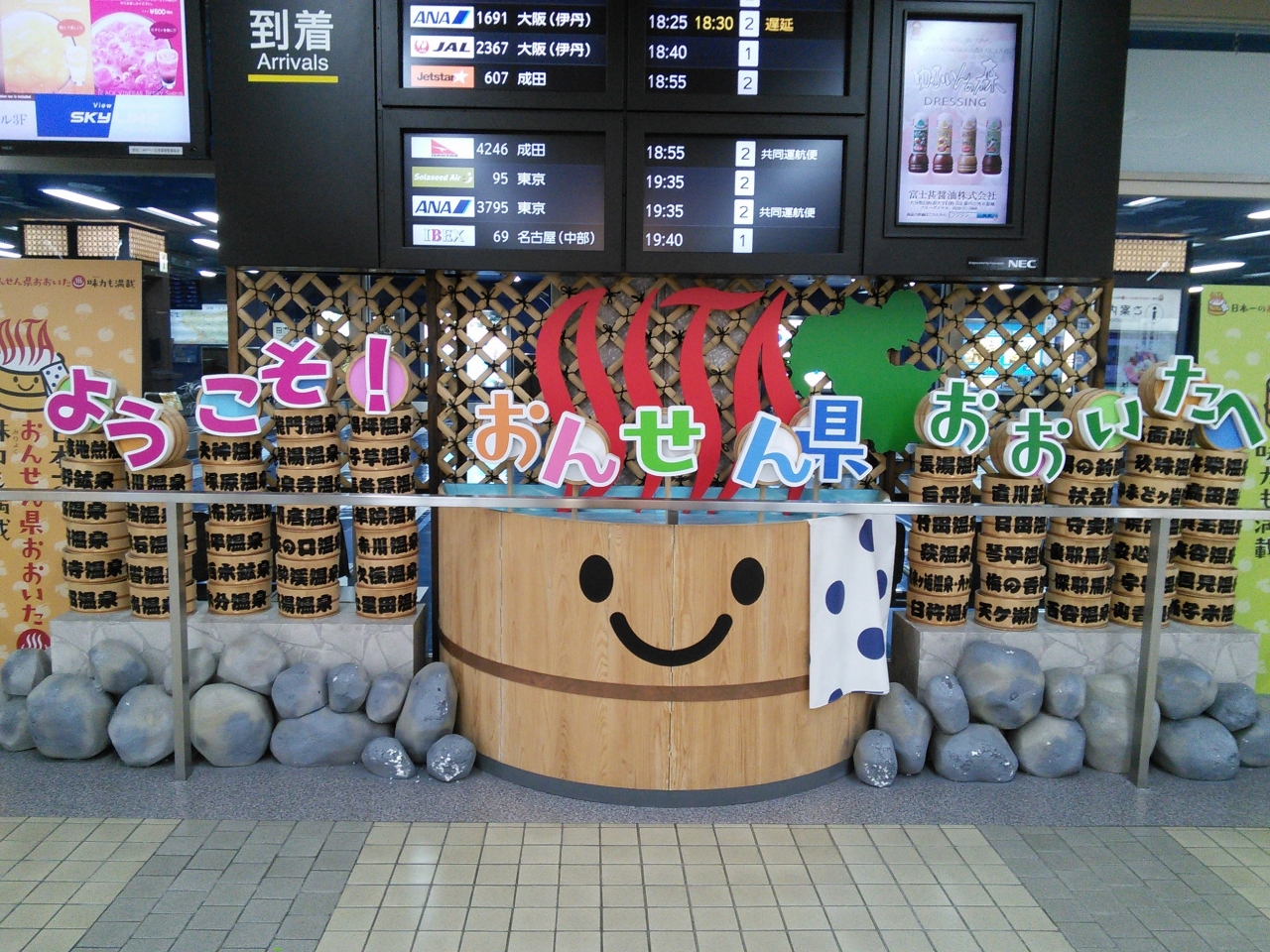いいですね。この空港。まず、到着してすぐに足湯があります^^;足湯は別府あたりとくらべて泉質はよくはありません。しかしこのサービス精神はどうよ!もうついたとたんに気分が盛り上がります。そして、出発するとき。寄付金の貯金箱。。。すごいよ。寄付しないでは大分を出られません。最高。