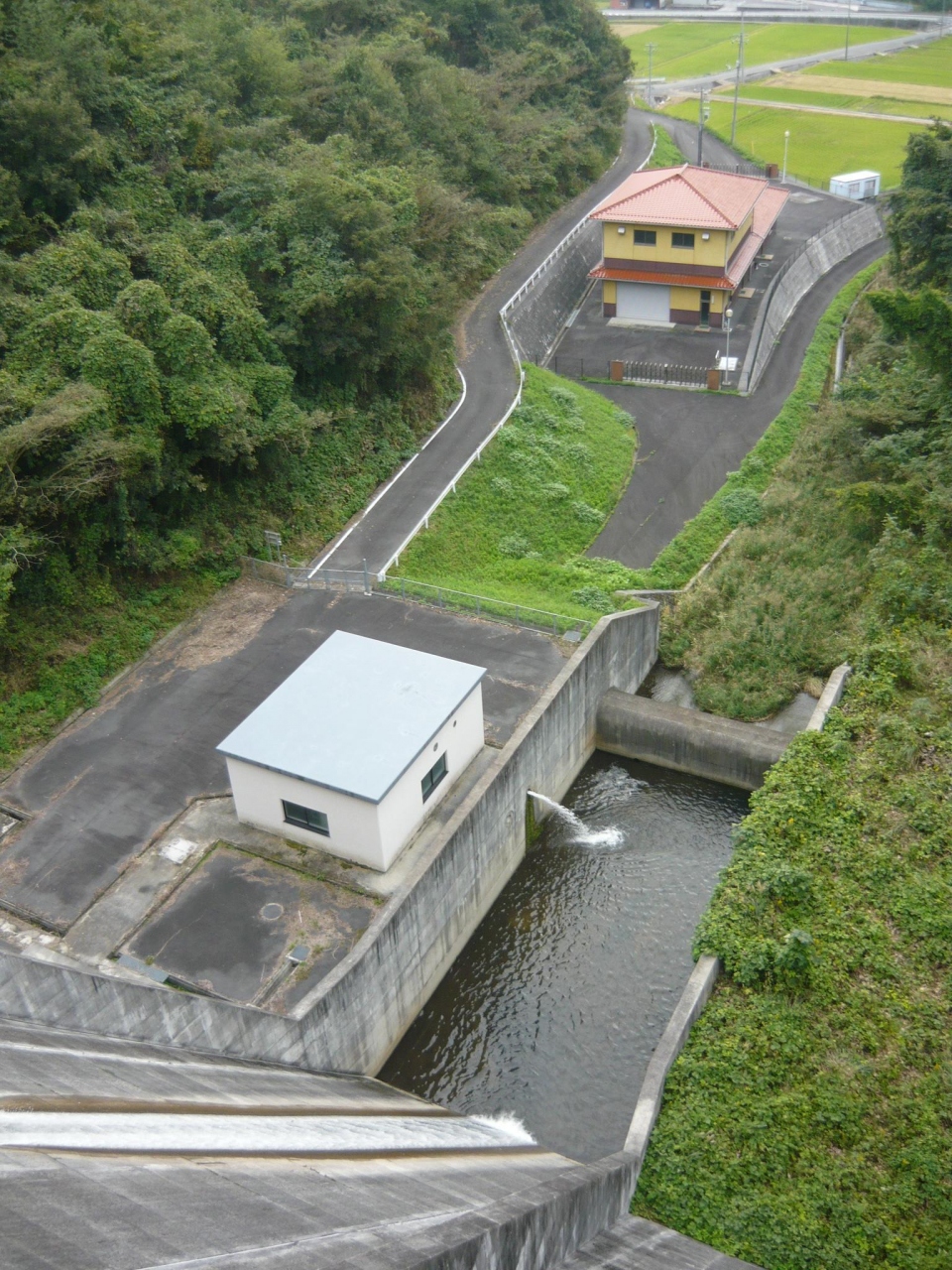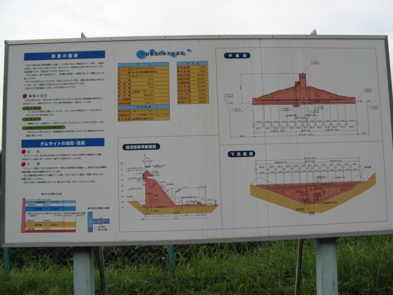 高梁市街から車で30分余り、県道31号線から側道に入ってすぐに正面にダム堤体が見えます。竣工が2003年と言う比較的新しいダムで、自由越流方式のシンプルな構造で、ダム堤体上は、車も通行が可能です。小規模なダムで高さも低く、ダム堤体上から下流側を覗いてもそれほど迫力はありませんが、オリフィスからはしっかり放流している姿が観えました。ダムサイト左岸に周辺の案内図やダムの構造や仕様を示した説明板がありました。