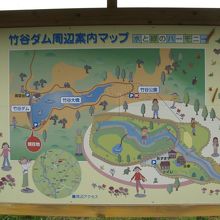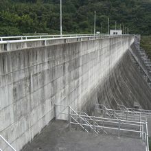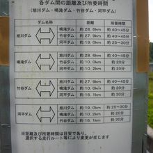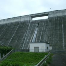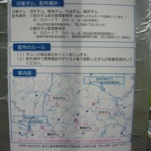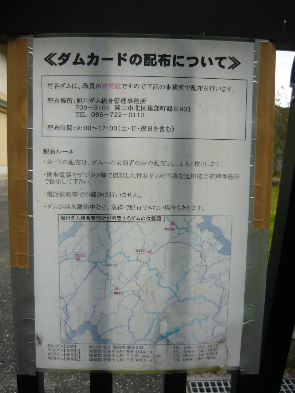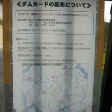 ダムサイト右岸に管理所があり、一般の人が利用できる駐車場はあります。すぐそばの小高い位置には展望台もありました。管理所は通常は無人になっていて門扉にダムカード配布についての表示(添付写真を参照ください)があったので、それに従って“旭川ダム統合管理事務所”に出向き、ダムを訪れた証拠写真を提示してダムカードを頂くことができました。周辺のダムまでの距離や所要時間を明示したものが掲示されているのも、ダム巡りをしている者にとってはありがたかった。