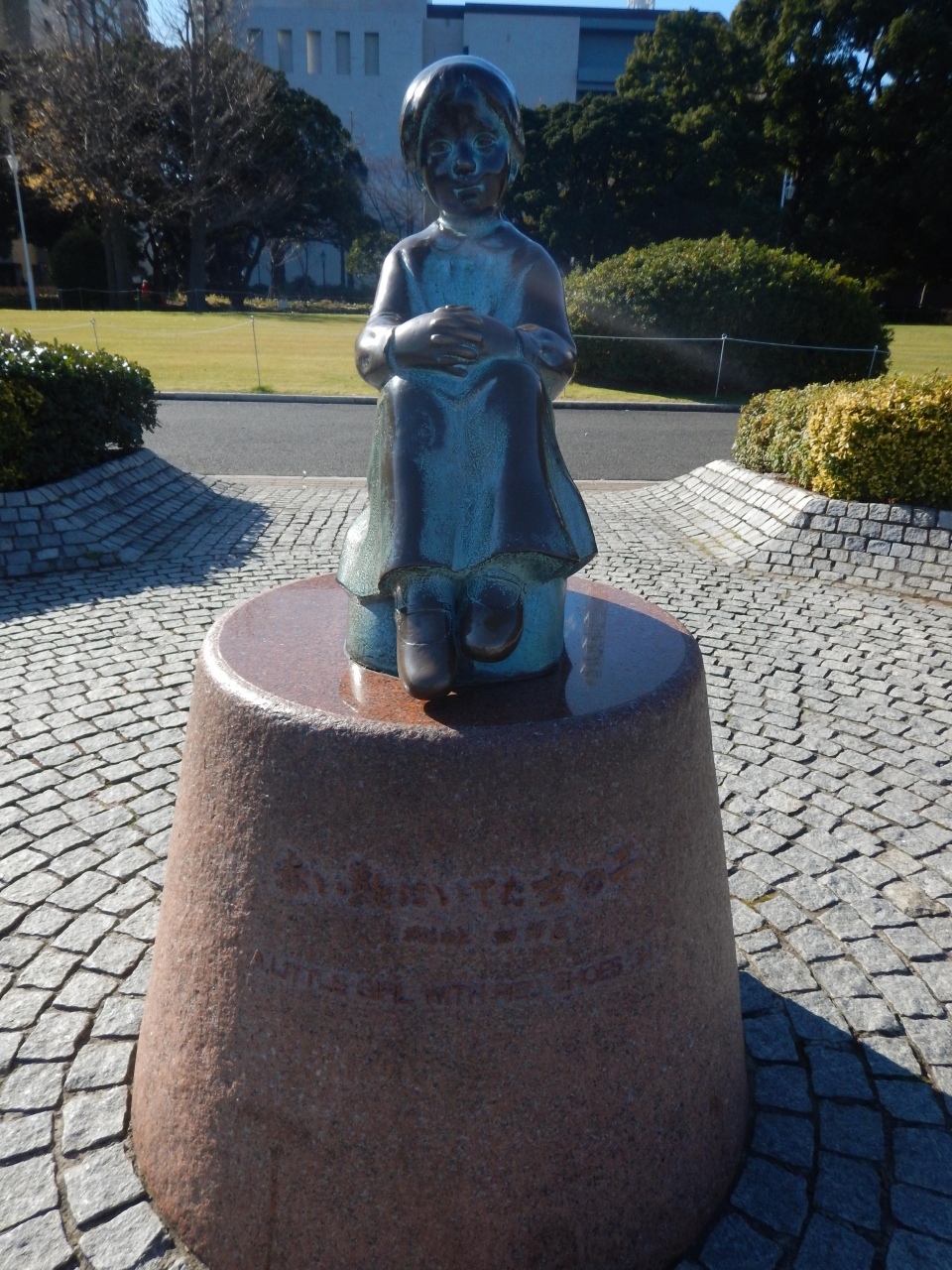 「赤い靴はいてた女の子像」は山下公園の真ん中ぐらいのところにあり、なかなか見つけられず、犬の散歩をしていた地元の方らしき人に尋ねてやっと見つけました。私の勝手な想像で、海沿いにあるのかと思っていたら、通路をはさんで反対側でした。とても小さな銅像で、写真を撮っている人もいませんでした。銅像の女の子の表情は悲しげに感じました。