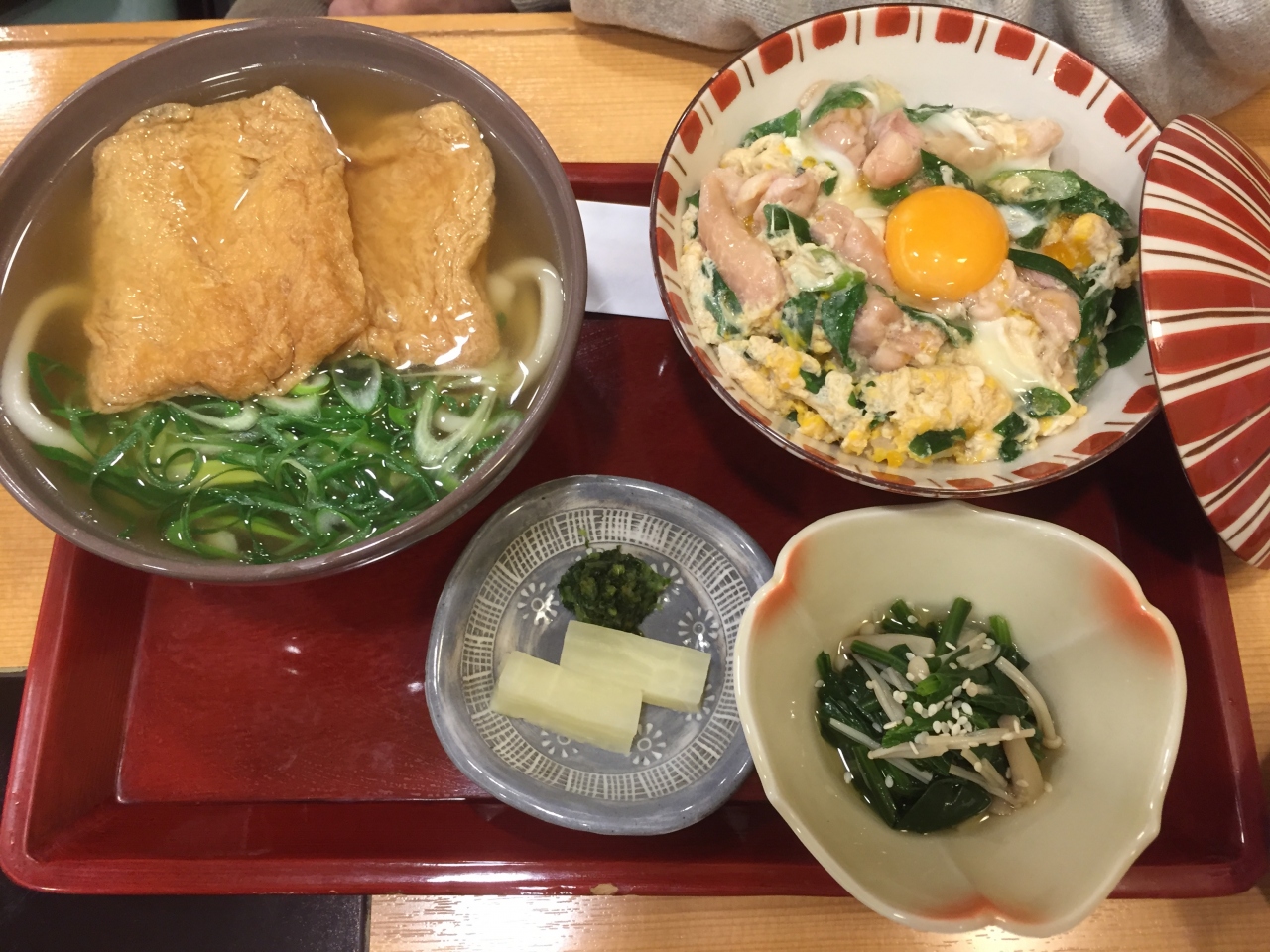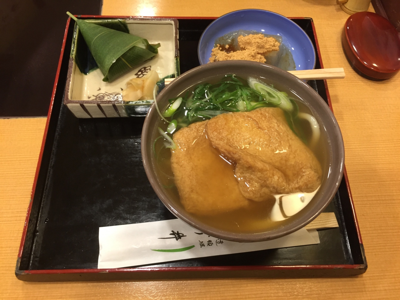 私はきつねうどんと笹寿司のおすすめセット。夫はきつねうどんと小さい親子丼のセットをいただきました。関西らしい上品な味のお出しと甘いおあげ、もちもちしたおうどん。美味しくいただきました。セットのわらび餅も美味。