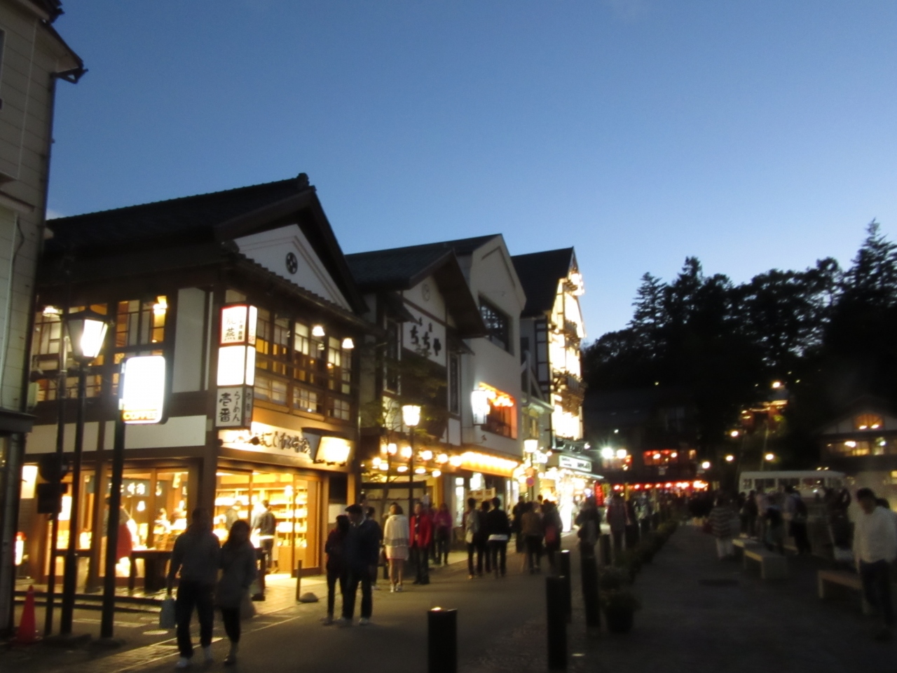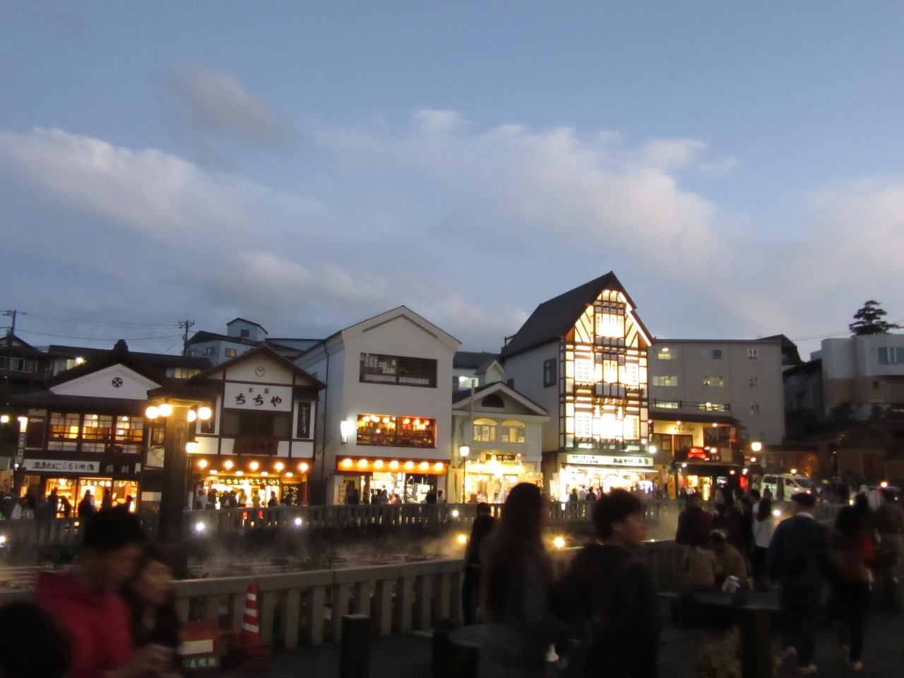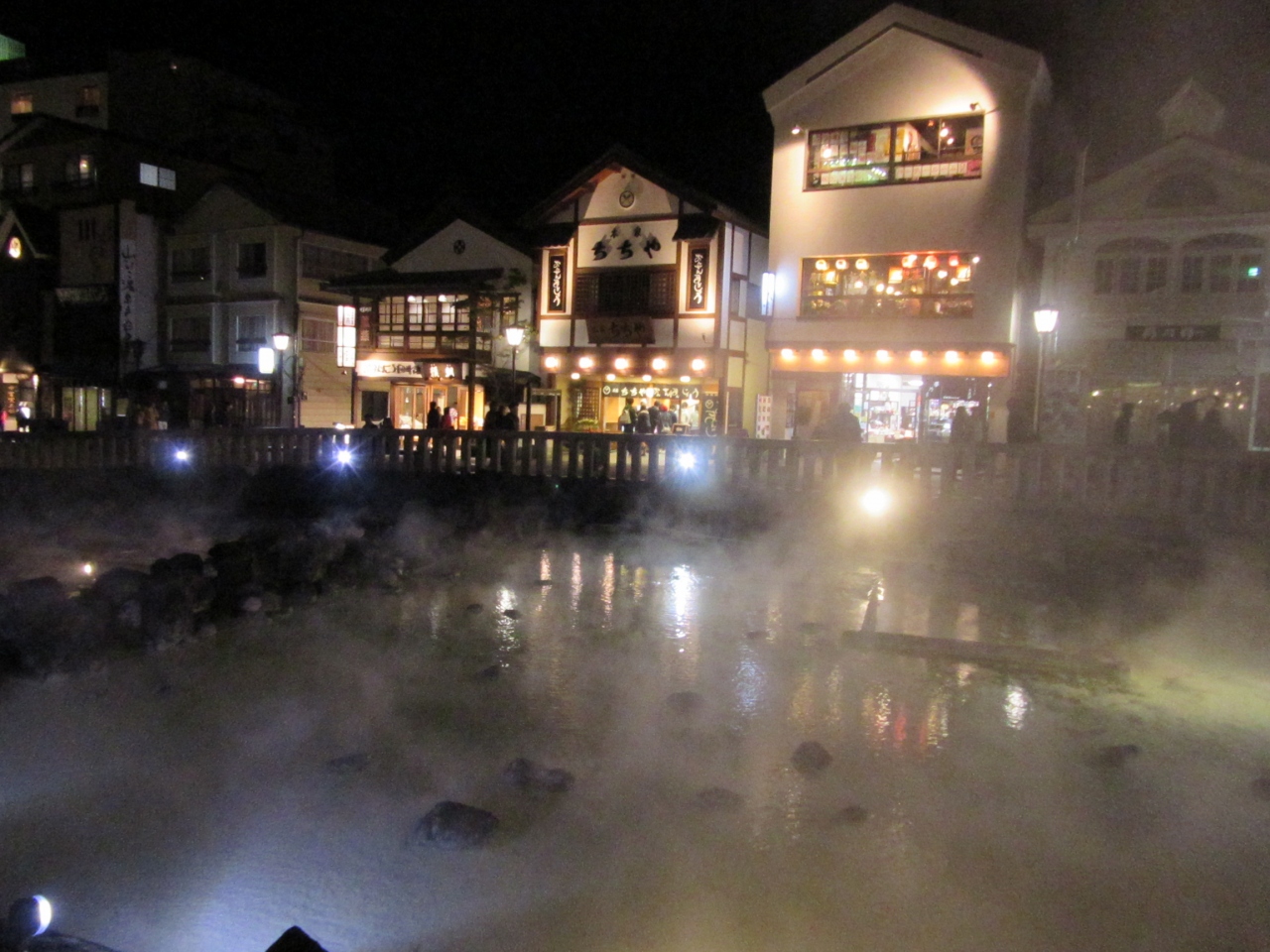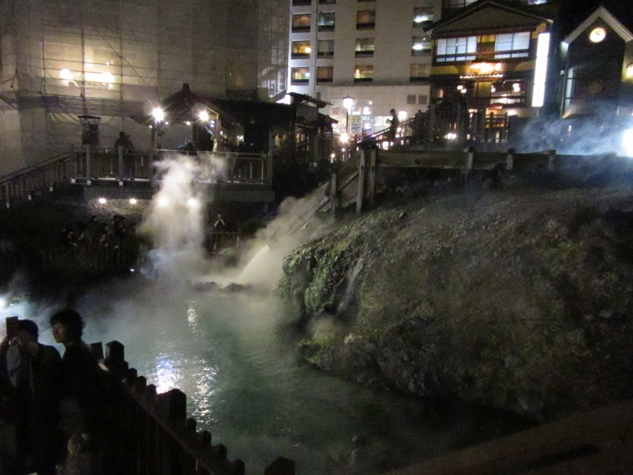 暗がりの中、建物の灯りや街灯にの光に映える湯煙は情緒満点でした。