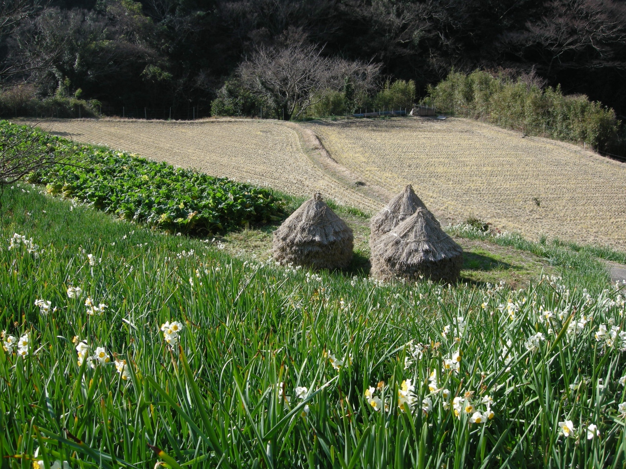 新春の鄙びた里山に水仙が咲き乱れる