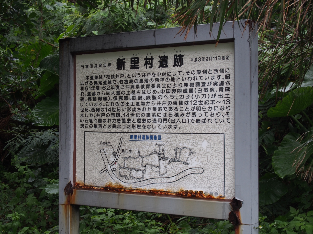 竹富島の北の端にある集落の遺跡が新里遺跡です。竹富島の発祥の集落だそうですが、現在は木々で覆われた森の中にある廃墟です。ほとんどの家なども朽ち果てて、かつての面影はほとんどありません。集落の中には花城井戸があり、これが新里遺跡のいい目印になっています。レンタサイクルで訪れましたが、交通の不便の場所なので人影はありませんでした。