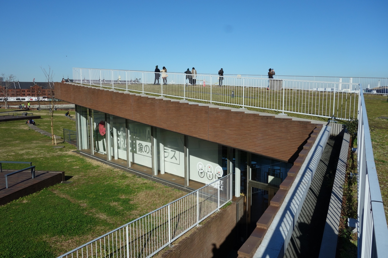 公園?なんでしょうかね、これは? 象の鼻テラスというレストハウスがあり、屋上が芝の展望台になっていて屋上庭園のような構造が面白かったです。青い象のようなキャラクターの車止め?が置いてあったり、いろいろシュールな雰囲気が悪くないです。年末でしたが、暖かい日だったので散策が楽しかったです。