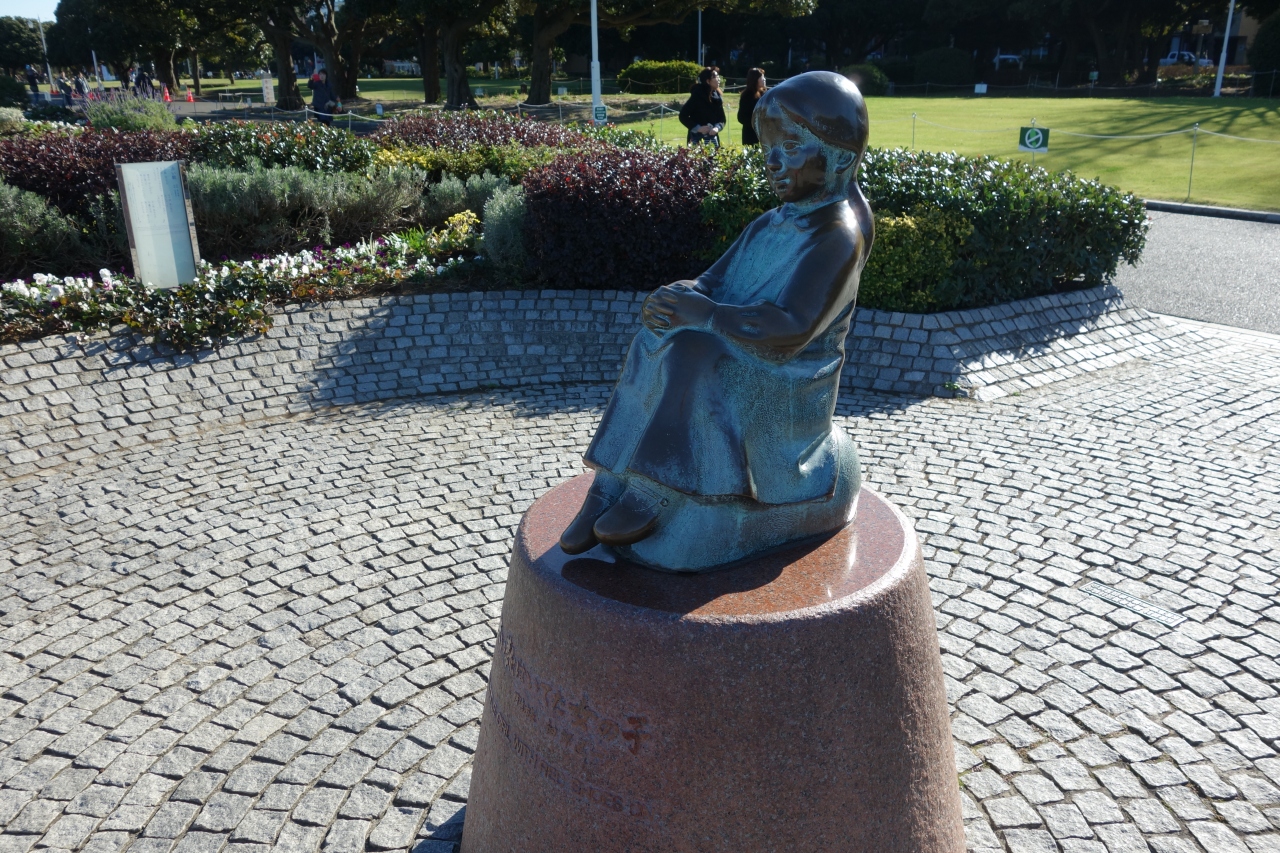 野口雨情作詞の童謡を基にして作られた銅像です。この辺りには何度も来ていますが、この像の存在には気がつきませんでした。思ったよりも小さな像ですが(幼い女の子なので小さくて当たり前ですが)、穏やかな表情をしており、海辺の山下公園の風景とよく溶け合っています。