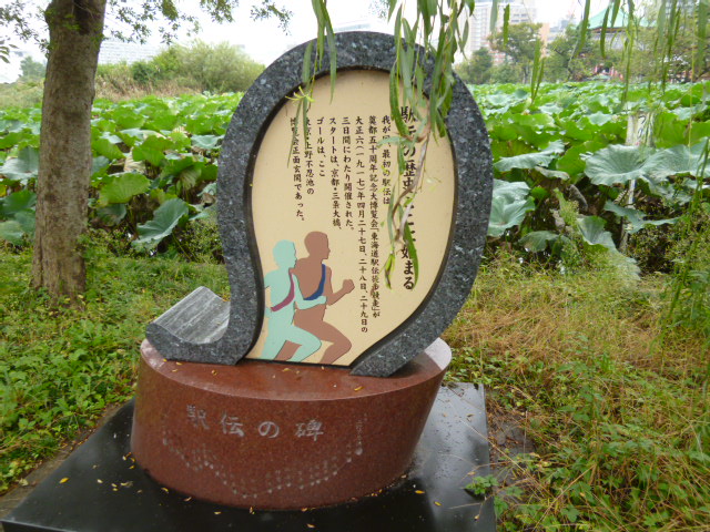 帝都50周年記念大博覧会の一環として、京都と東京の間で、初めての駅伝競走が実施され、そのゴール地点がここ不忍池であったとのことで、ここに駅伝の碑が立てられたようです。この口コミを書く数日前には箱根駅伝が開催されましたが、その誕生の契機となったのが京都とここ東京不忍池を結ぶ駅伝であったとの歴史を勉強した後だけに、よけいに駅伝の応援にも熱が入りますね。駅伝の歴史を知る上で実に貴重な「駅伝の碑」だと思いました。