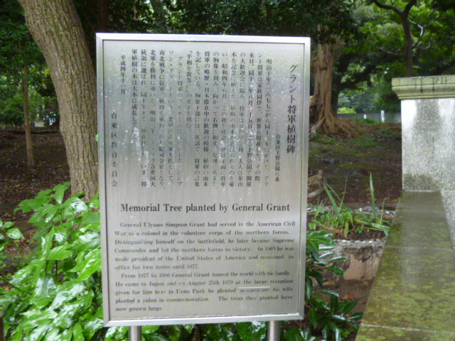 上野恩賜公園の上野東照宮を訪れた際に見学しました。米大統領を二期務めたグラント将軍は、明治時代に家族同伴での世界旅行の際に日本に長期滞在し、その際に植樹をされたそうです。そうした歴史を忘れないために太平洋戦争勃発の前、昭和4年に記念碑が立てられたと説明文に書かれていました。当時の人も、時代のきな臭さを感じ取ったのでしょうか。