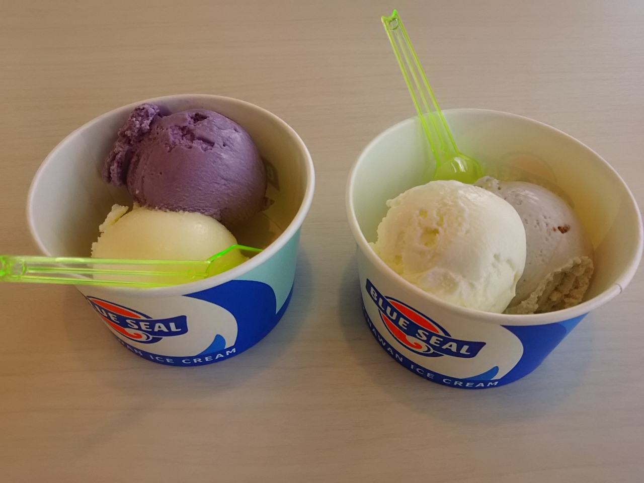 私たちは「シークァーサー&ウベのミックス、ココナッツ&田芋チーズケーキのミックス」をひとつずつ注文~沖縄らしい味わいに大満足!