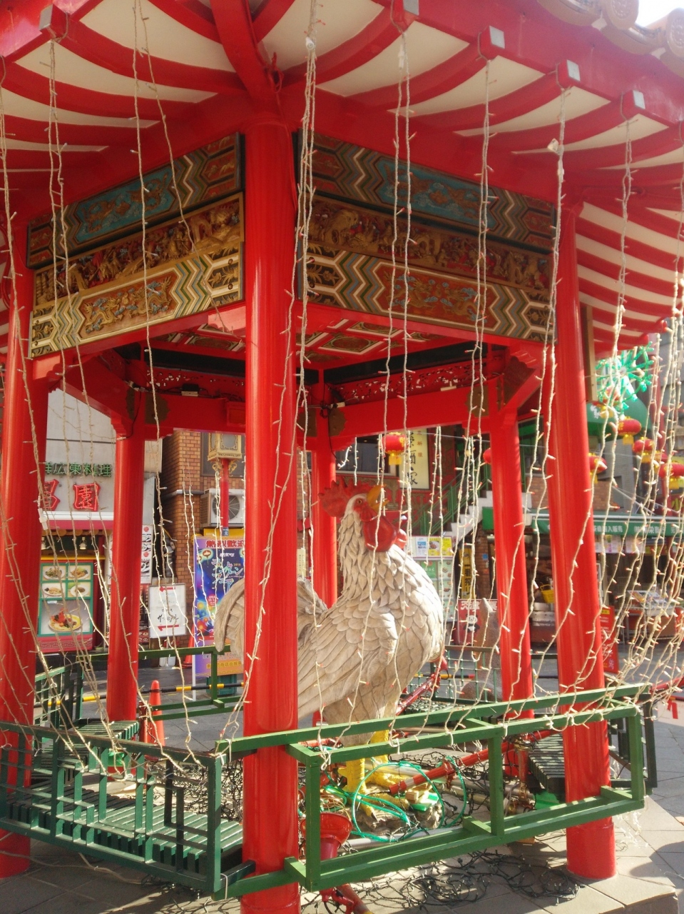 神戸の中華街「南京町」にある広場です。広場は、それほど広くはありませんが、広場の中心には、今年の干支である大きなニワトリが飾られていました。また、豚まんなどの食べ歩きをすることができることもあり、色々なお店で買った食べ物を広場で食べている人もたくさんいました。この広場から周囲を見渡すと、南京町にいるという実感が持てます。