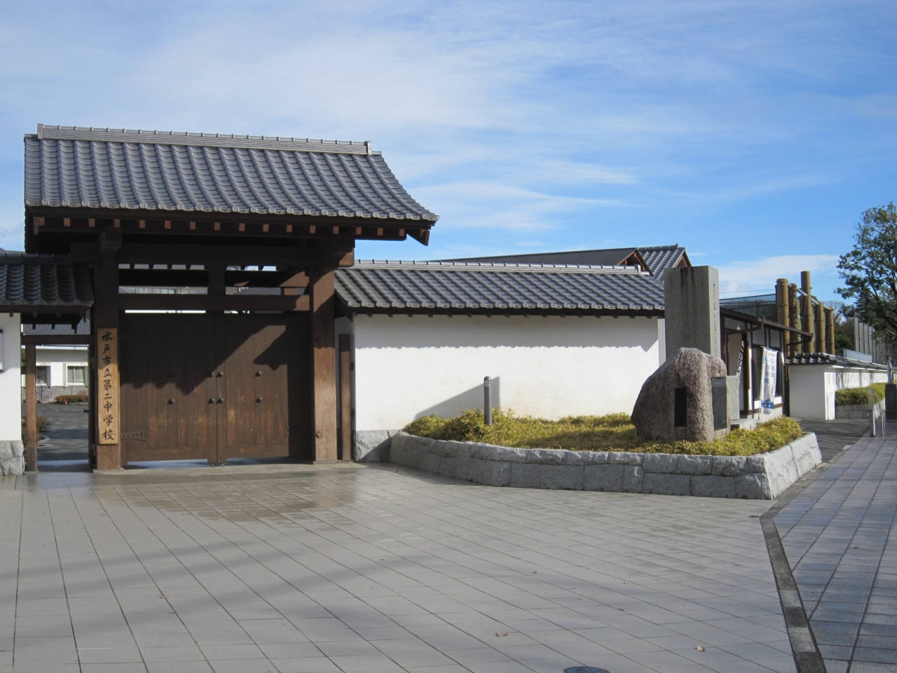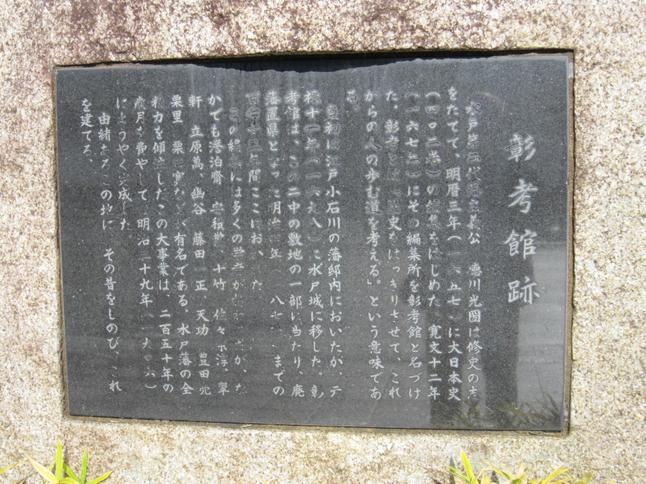 水戸彰考館は水戸光圀によって始められた大日本史を編纂した所で、江戸に開かれ、後に水戸に移り、明治維新以後も編集を続けて完成して閉館になったそうです。第二中学校が彰考館の跡地で校門右脇に石碑がありました。水戸藩の学問は「大日本史」の編纂がきっかけとなり盛んになったそうで、石碑は卒業生が寄贈したそうです。