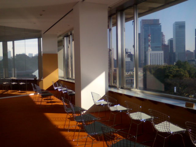 4階の「眺めの良い部屋」ってどんなだろう、と入ってみると、お堀、皇居の緑が目に入ってきました。テーブルや椅子も十分あるので、とてもくつろげます。