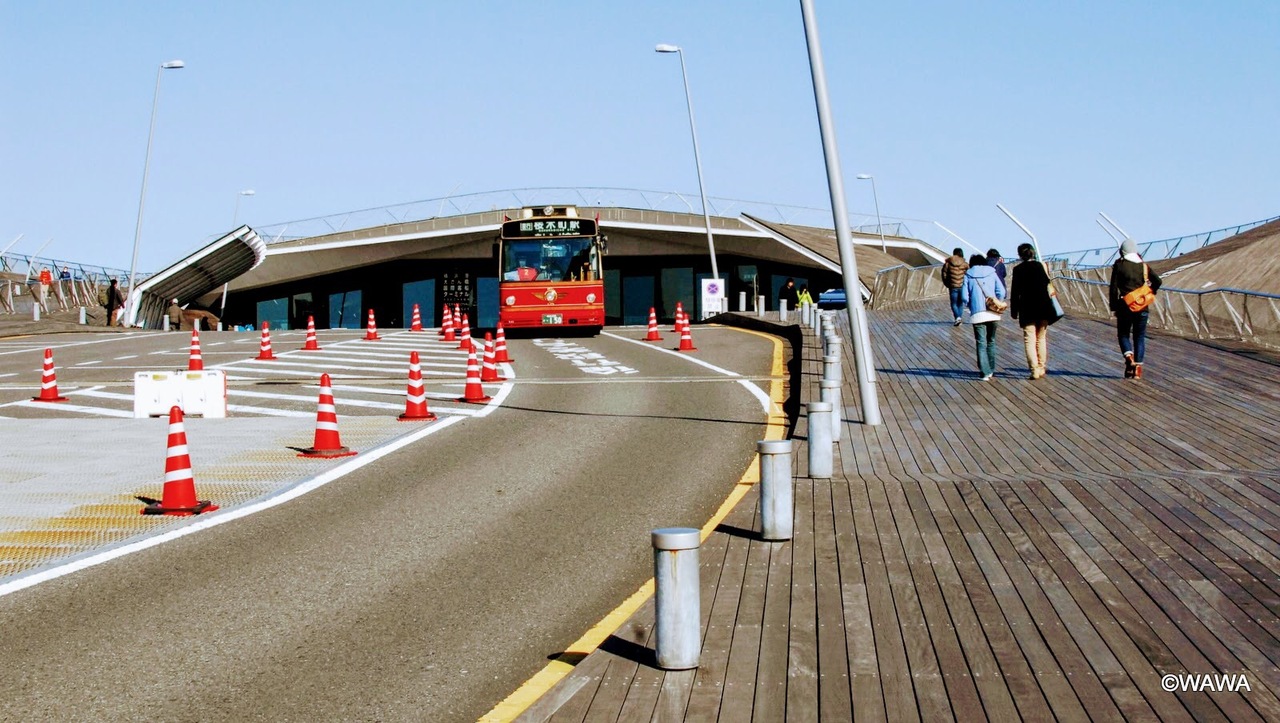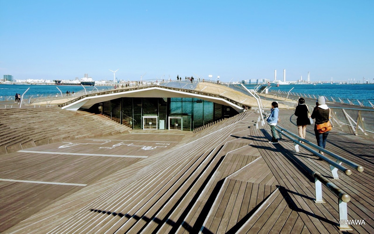 通称"大さん橋" こと 横浜港大さん橋国際客船ターミナルは大型客船用の桟橋ですが、広大な屋上は全体が展望デッキ、内部には店舗やホールがあり、天気が良い時には横浜港の眺めを満喫出来る無料の観光地です。特に突端部には双眼鏡が備え付けられ、対岸の大黒埠頭あたりで働く船までを見渡すことが出来るので、子供連れでも飽きることがありませんでした。