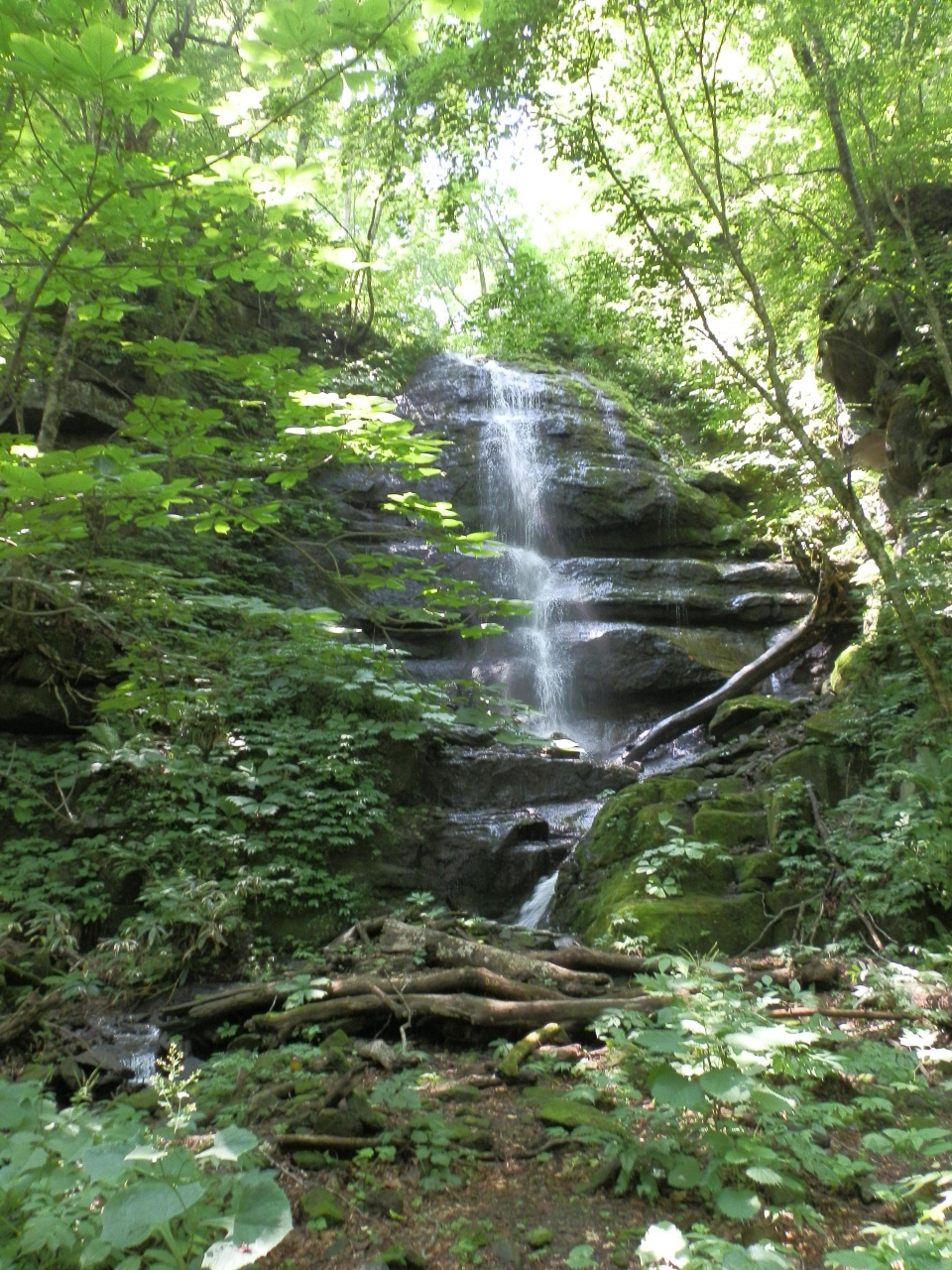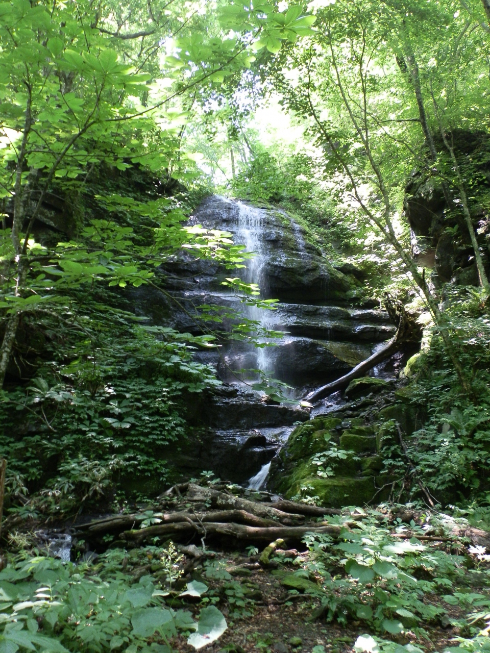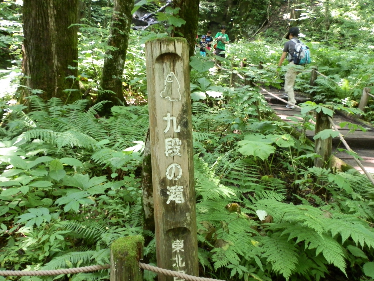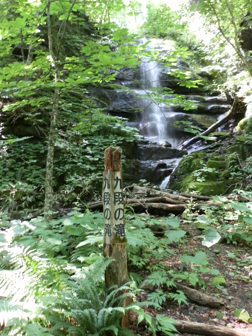 ダイナミックな「銚子大滝」の手前に対照的な水墨画が似合う「九段の滝」がある。階段上の地層を、幾筋もの細い線で岩肌を滴るように流れ落ちる滝、これが「九段の滝」の魅力です。