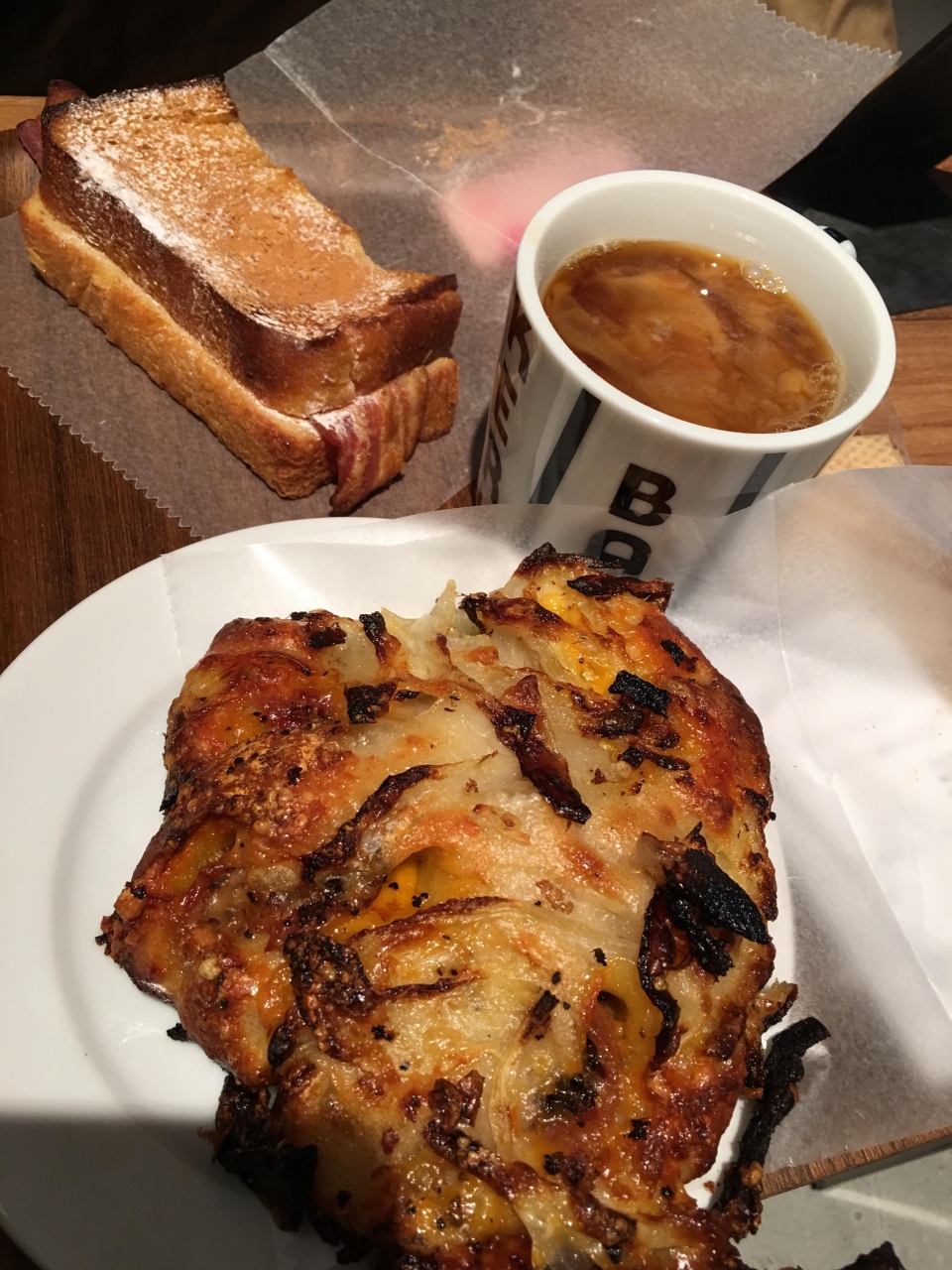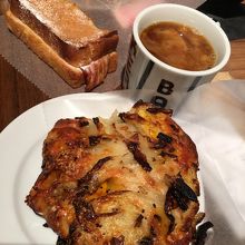 オニオンのパン420円1つと、500円のセット(コーヒーとフライドポテト)を頼みました。