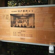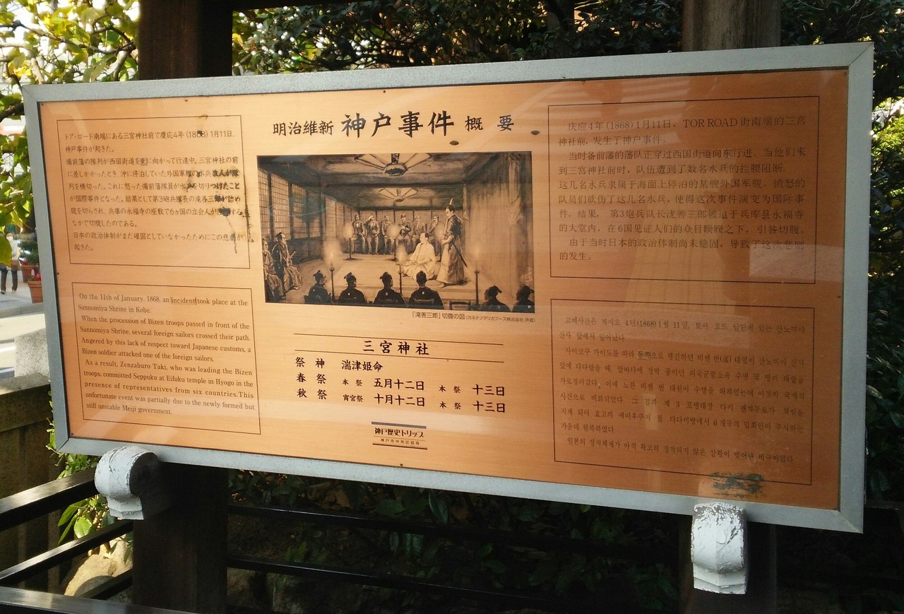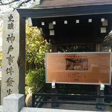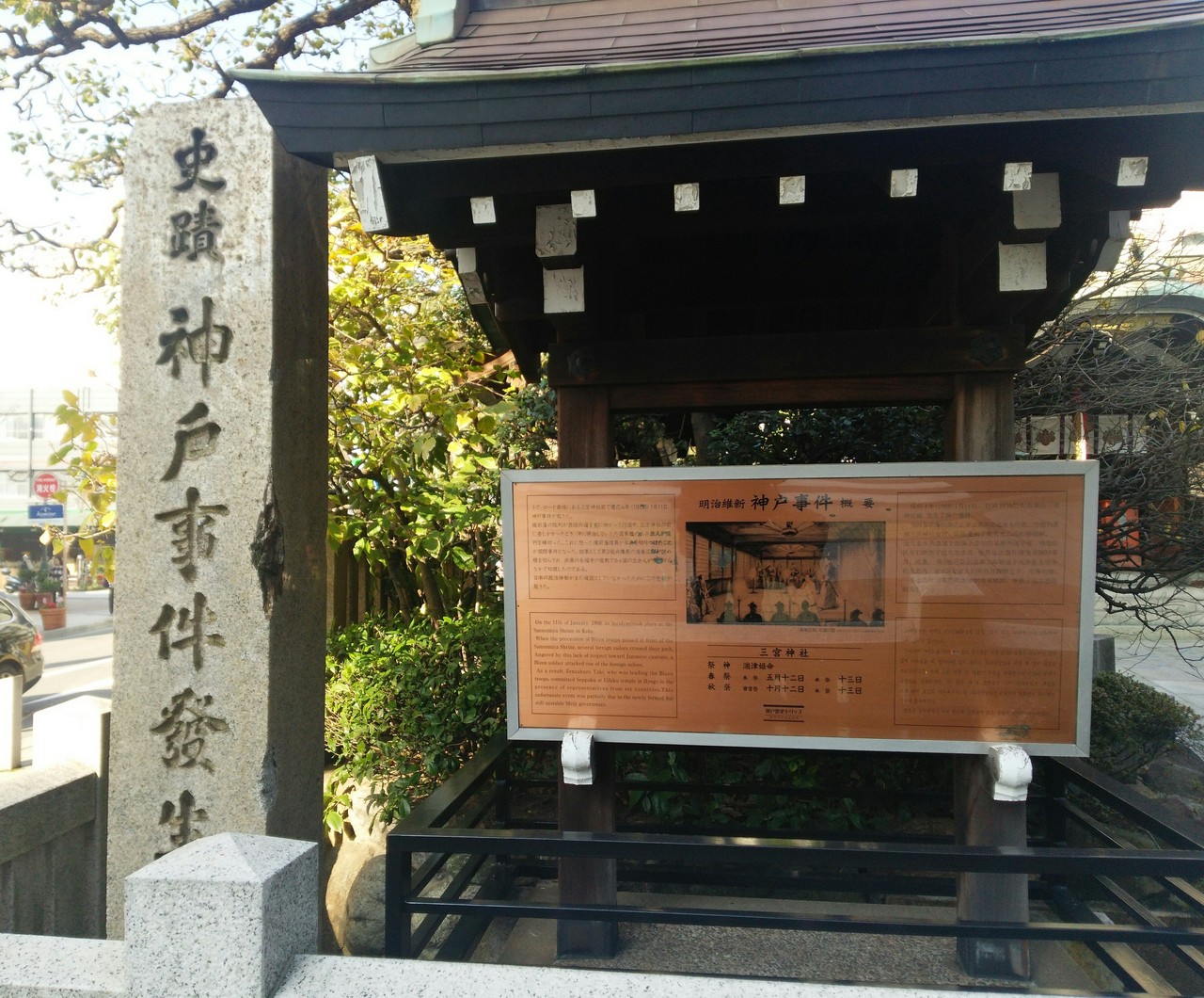 JR元町駅から徒歩数分、大丸神戸の向かい側にある三宮神社の傍らに「神戸事件発生地碑」はありました。神戸事件は、三宮神社前において備前藩兵が隊列を横切ったフランス人水兵と衝突した事件です。神社の境内には当時使われた大砲と同型の大砲も展示されていました。歴史的には貴重な場所ですが、現在はその面影は全くないため、特に気にしなければ素通りしてしまうようなものでした。