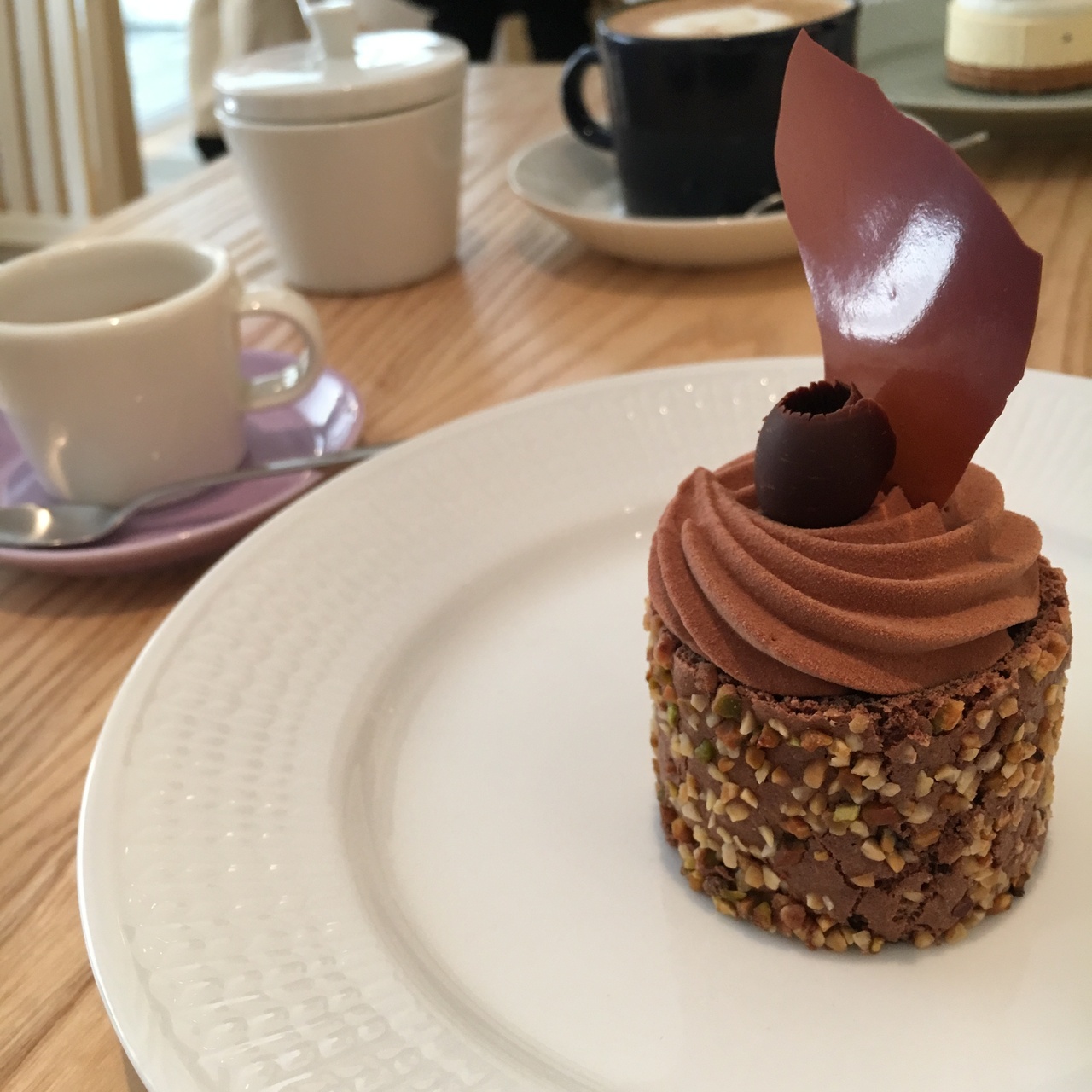 イートインで私はエスプレッソとチョコのムースを注文しました。食器も可愛いです♪エスプレッソは少しぬるかったです。。そんなものなんでしょうか。お友達のカフェラテはラテアートもされてて可愛かったです。