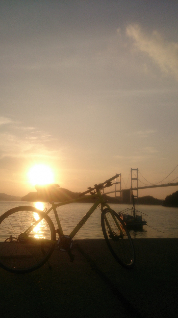 尾道からスタートすると夕日の素晴らしい時にクライマックスの来島海峡に差し掛かるので尾道から今治コースにしました。