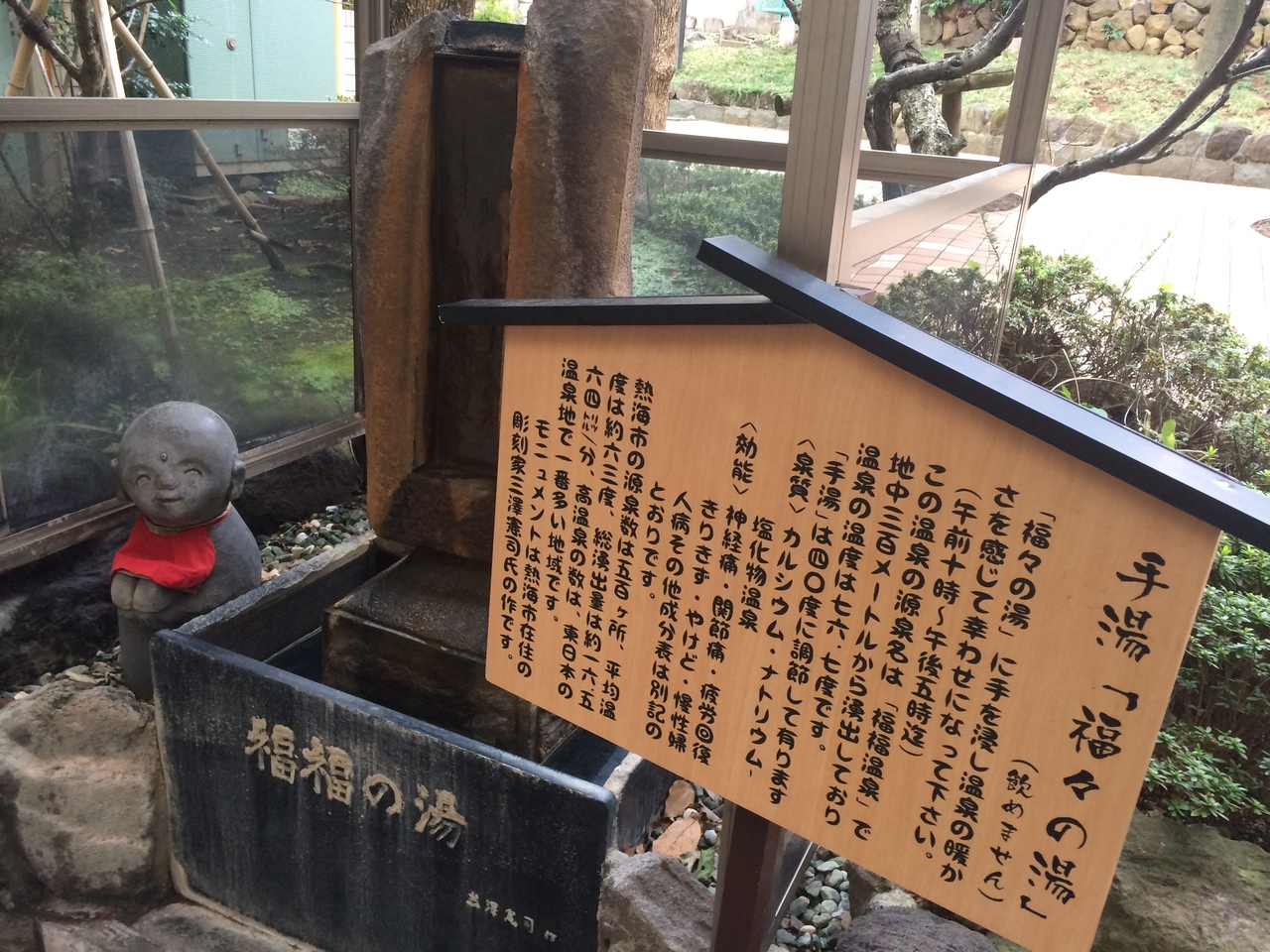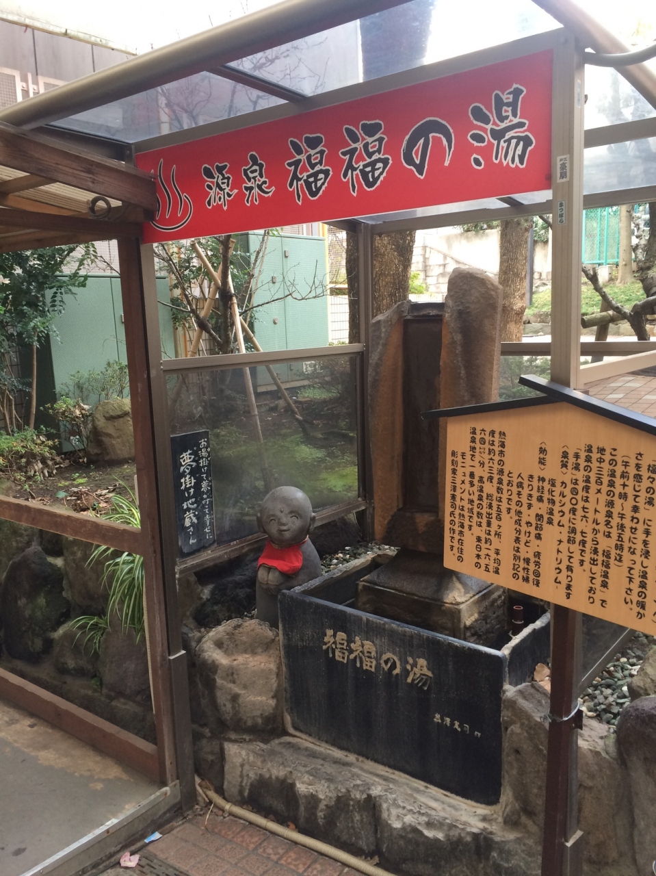 熱海駅から徒歩2~3分程の場所にあります。商店街の中にありウィンドショッピングで少し疲れた時に手湯の隣にあるお地蔵様の顔が微笑ましく和やかな気分になりました。手湯は源泉ですが掛け流しではなく10~17時まで湯が出ています。湯加減もちょうど良い熱さでした。