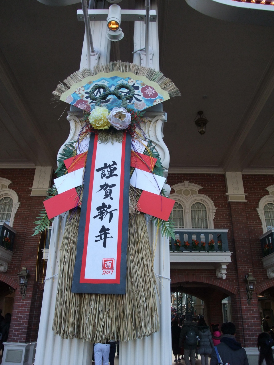 パークに入るとワールドバザール手前にあるウェルカムボードの前には門松やしめ縄が飾られおり、お正月の雰囲気が出てきます。