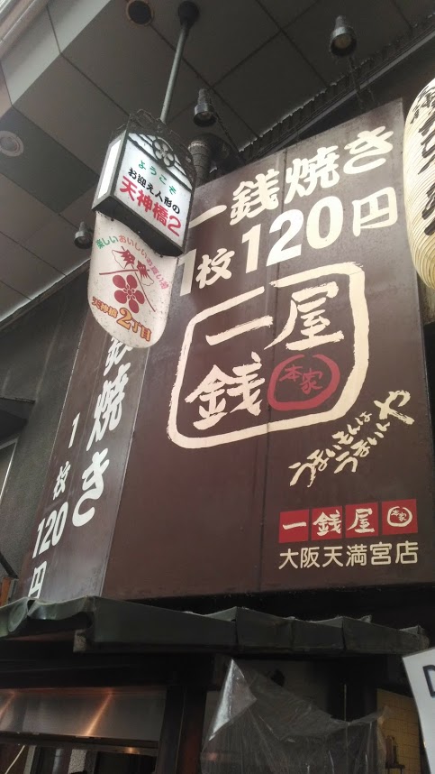 天神橋筋1丁目の北側、地下鉄南森町駅を上がってすぐ。お好み焼きの原点といえる一銭焼きが120円と驚異の値段でいただける。