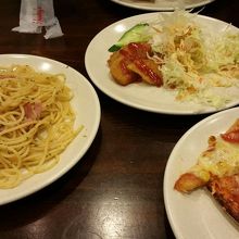 こちらのランチバイキングはピザの種類が多く、カレー、パスタ、サラダも充実しています。