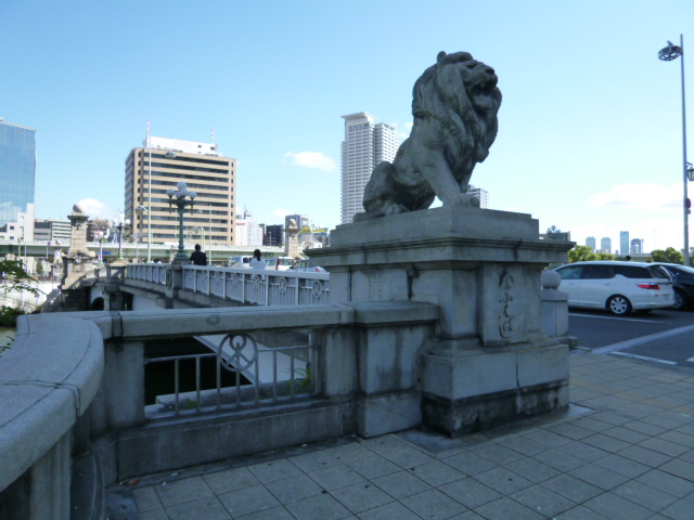 北浜のレトロな建築を巡った後、中之島公園へ向かう際にこの難波橋を利用しました。橋の欄干には大きなライオンの像があり、ライオン橋の方が覚えやすいですね。この橋を渡って階段を降りると、中之島公園バラ園になっています。ちなみに車の往来も激しく橋の途中で道路を横断することは危険なのでやめましょう。