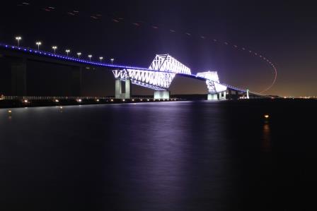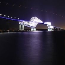 富士山と絡めて良し、夜空を行く飛行機の光跡と絡めて良し、もちろん海に浮かぶそのままの姿で収めても良し。インパクトのあるトラスの形状と美しいライトアップで、東京湾岸で最も存在感のある被写体となっている橋です。時刻を選ばず場所を選ばずで(天気は選ぶかもしれませんが…)、いつどの方向から眺めても面白い光景を見ることができるでしょう。東京の財産ですね。