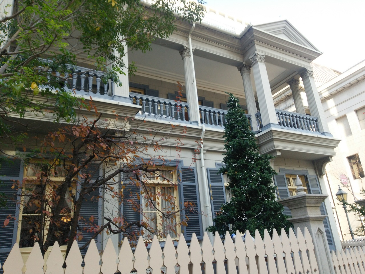 旧居留地15番館はたくさんのビルに囲まれた場所にありました。旧居留地に唯一現存する居留地時代の建築物で、元々は旧アメリカ合衆国領事館として使用されていたもののようですが、建築物の外観はとてもオシャレで居留地時代に建てられた建物とは思えないほどキレイなデザインでした。