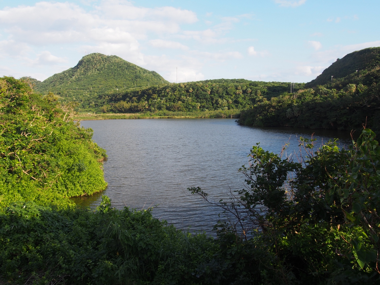 久部良ミットゥは久部良集落の東側にある大きな池あるいは湖です。池(湖)は水路で久部良漁港とつながっており、海の干満で池に水が入るようになっているようです。海水と真水が混ざった汽水湖のようです。それを示すような気水域での植物がみられました。