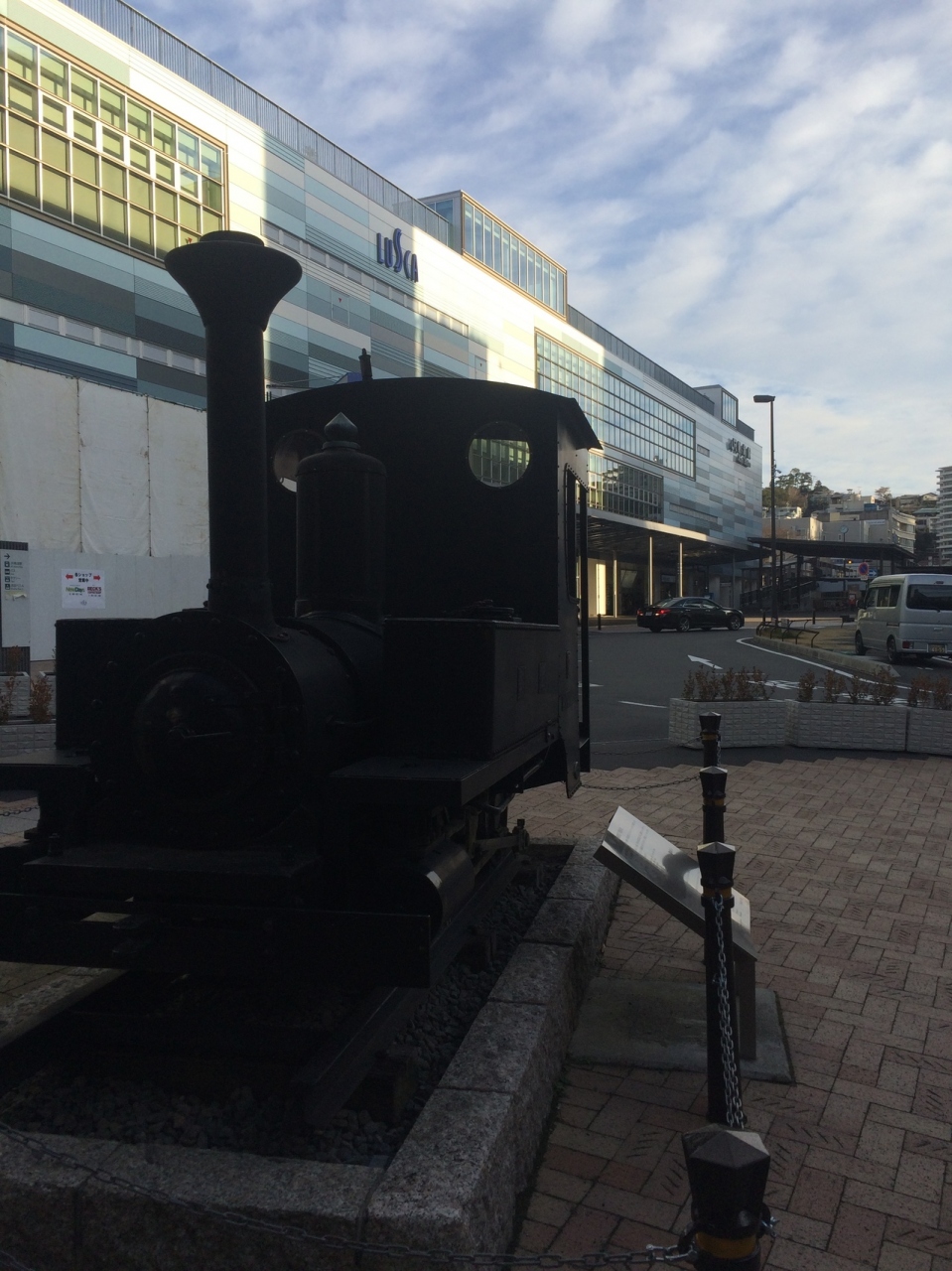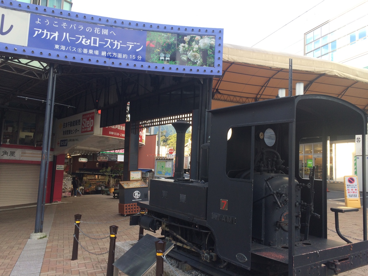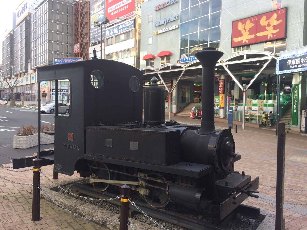 熱海駅ロータリーの商店街に入る前にあり、明治~大正時代に活躍した小さな機関車で熱海~小田原間を走っていました。当時の所用時間は160分で、現在は東海道線25分、新幹線10分と記載があるのが興味深かったです。機関車は小さくて可愛らしいです。