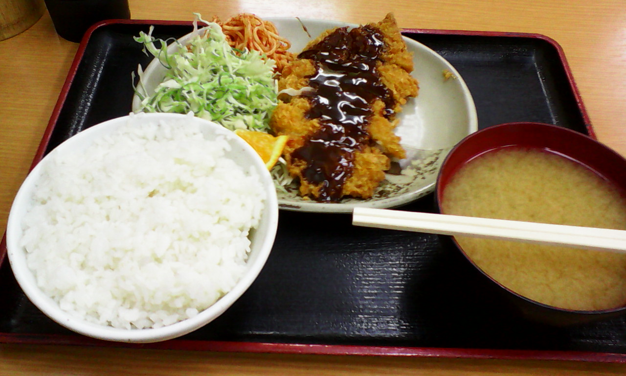 300円という安さに惹かれて注文してみたのですが、意外とちゃんとした大きさのカツに刻みキャベツ、そして付け合せのスパゲティにごはん・味噌汁としっかりしたボリュームで、駅近くで手軽に食事を済ませるのに便利でした。