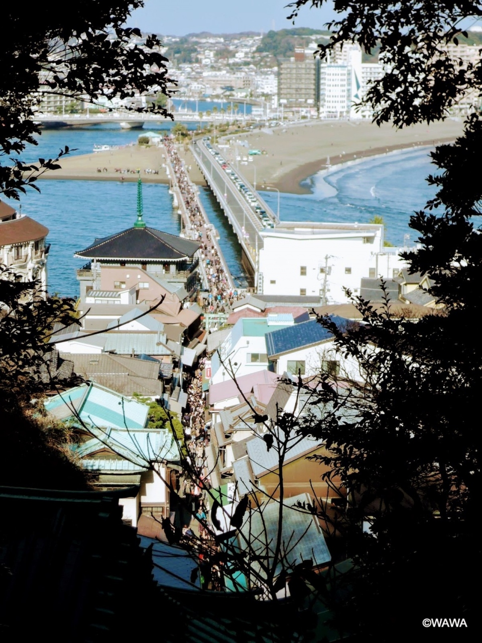 江ノ島大橋・江ノ島弁天橋は、藤沢市の片瀬地区と、目の前に浮かぶ江ノ島を結ぶ長い橋です。車道を江ノ島大橋、歩行者専用橋を江ノ島弁天橋と呼び分けています。訪問時、車道は島内にもある駐車場待ちの行列渋滞、歩行者専用橋は着物姿も交じる正月の参拝客や観光客で溢れていました。長い橋ですが全体に低く作られているので、橋の上にいても海が近く散歩やサイクリングには最適な場所の一つです。