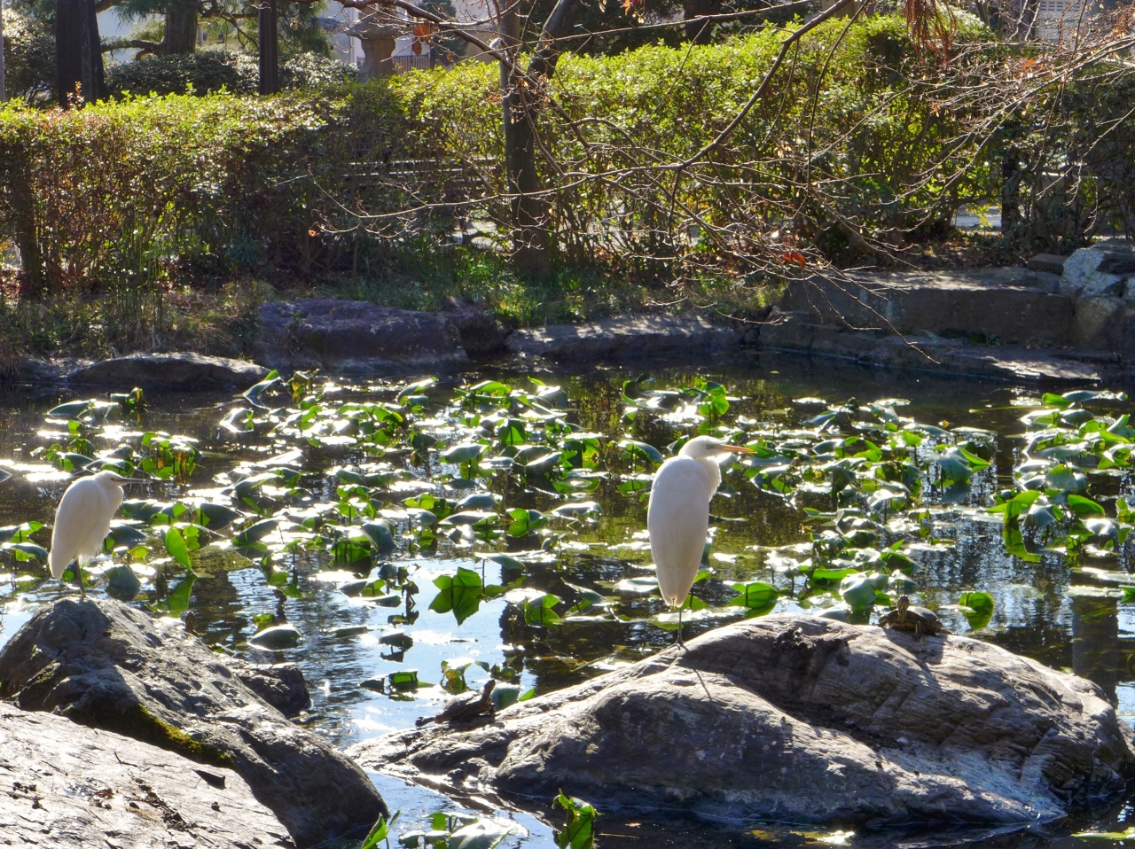 入り口の鳥居を潜り参道を入ると湧水を溜めた池に太鼓橋が架かり、池には白鷺や鴨が羽を休めていました。