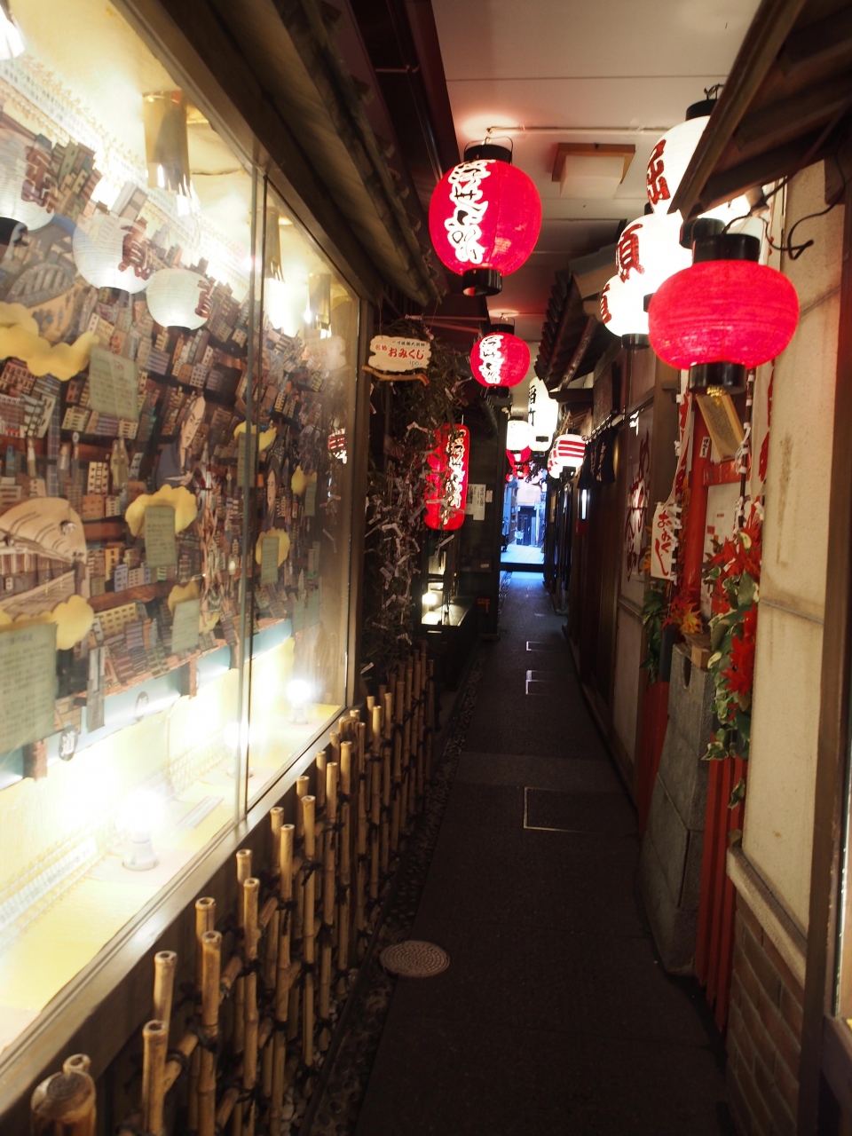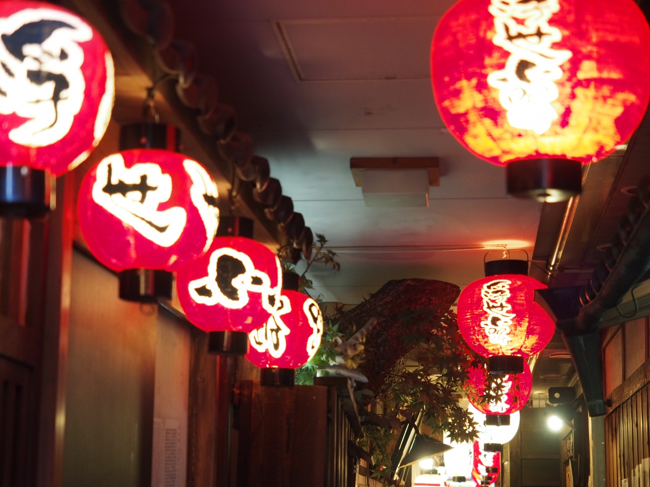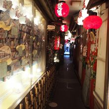 赤い提灯が並んで灯っていて、日本趣味の風情があって素敵なとても細く短いかわいい路地です。