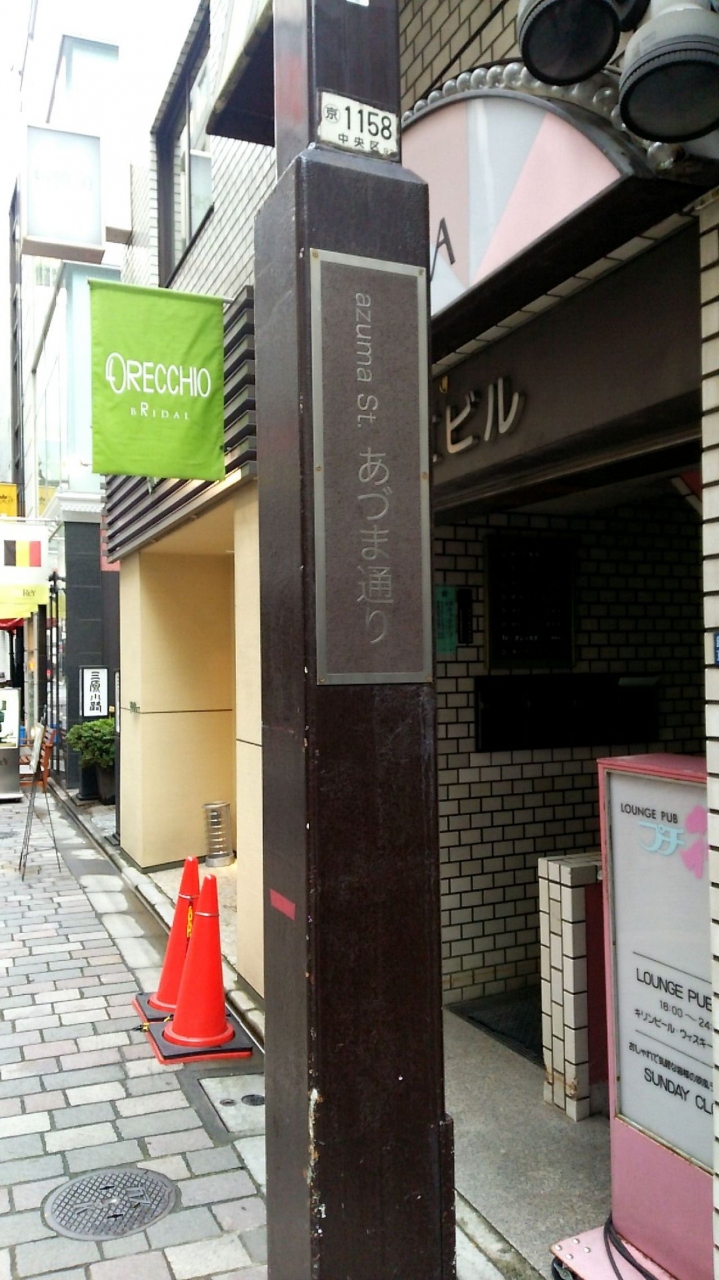 あづま通りは、銀座中央通りから1本入ったところにある裏通りです。通り沿いには飲食店などがありますが、銀座中央通りとは異なり、華やかさや賑わいに欠け、人通りも少ない通りでした。飲食店が多い通りなので、夜になると賑わう通りなのかもしれませんが昼間は寂しい感じの通りで特に特徴もありませんでした。