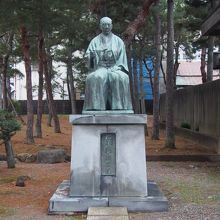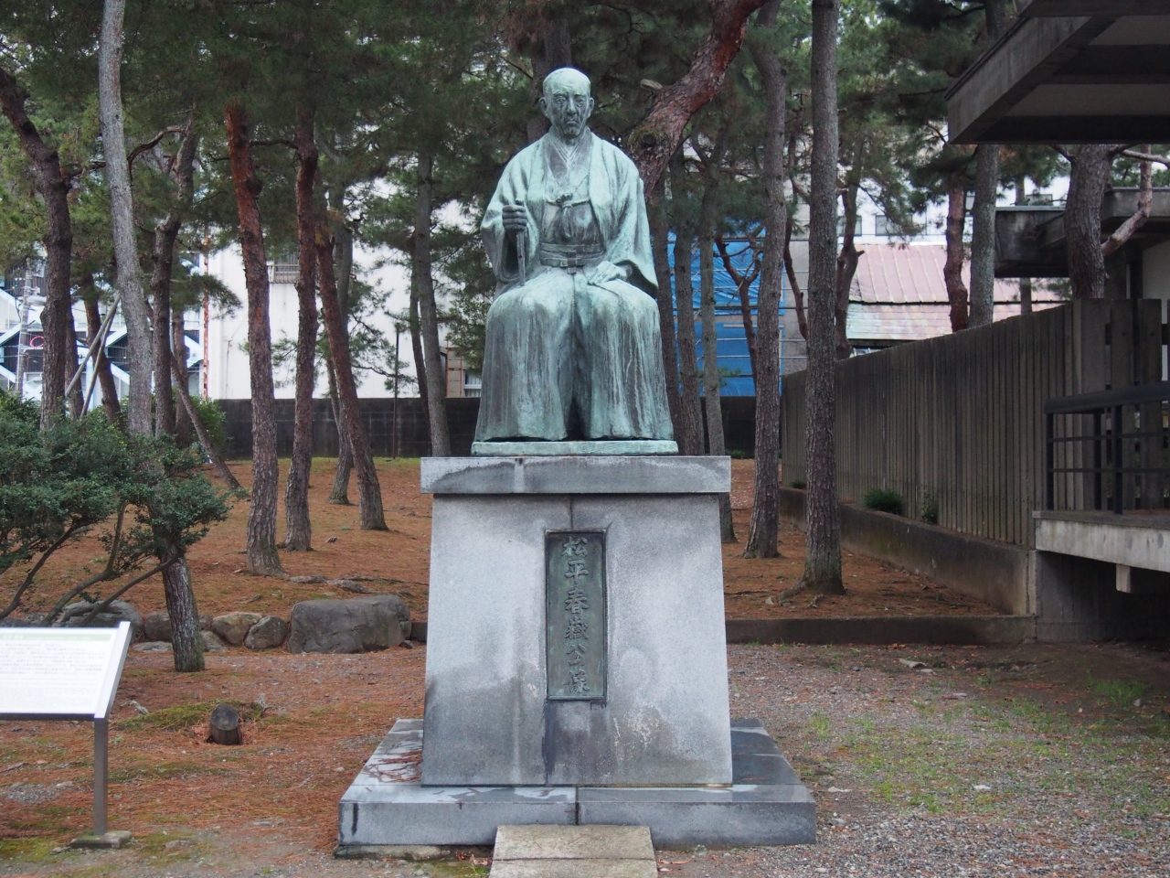 松平春獄の像は福井城址の堀の西側の福井神社の境内にあります。松平春獄は松平福井藩の16代藩主で、開明的な考えの人物で、幕末に活躍した人物です。本殿の横に松平春獄の裃を着けた座像があります。福井城址にある初代藩主であった結城秀康の像と比べると、こちらは風格のある像です。福井神社が松平春獄を祀った神社であるので、彼の像があるのも納得です。