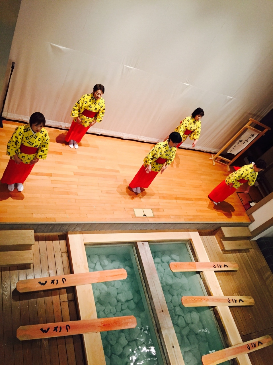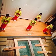 湯もみや踊りのショーの合間と最後に湯もみ体験ができます。