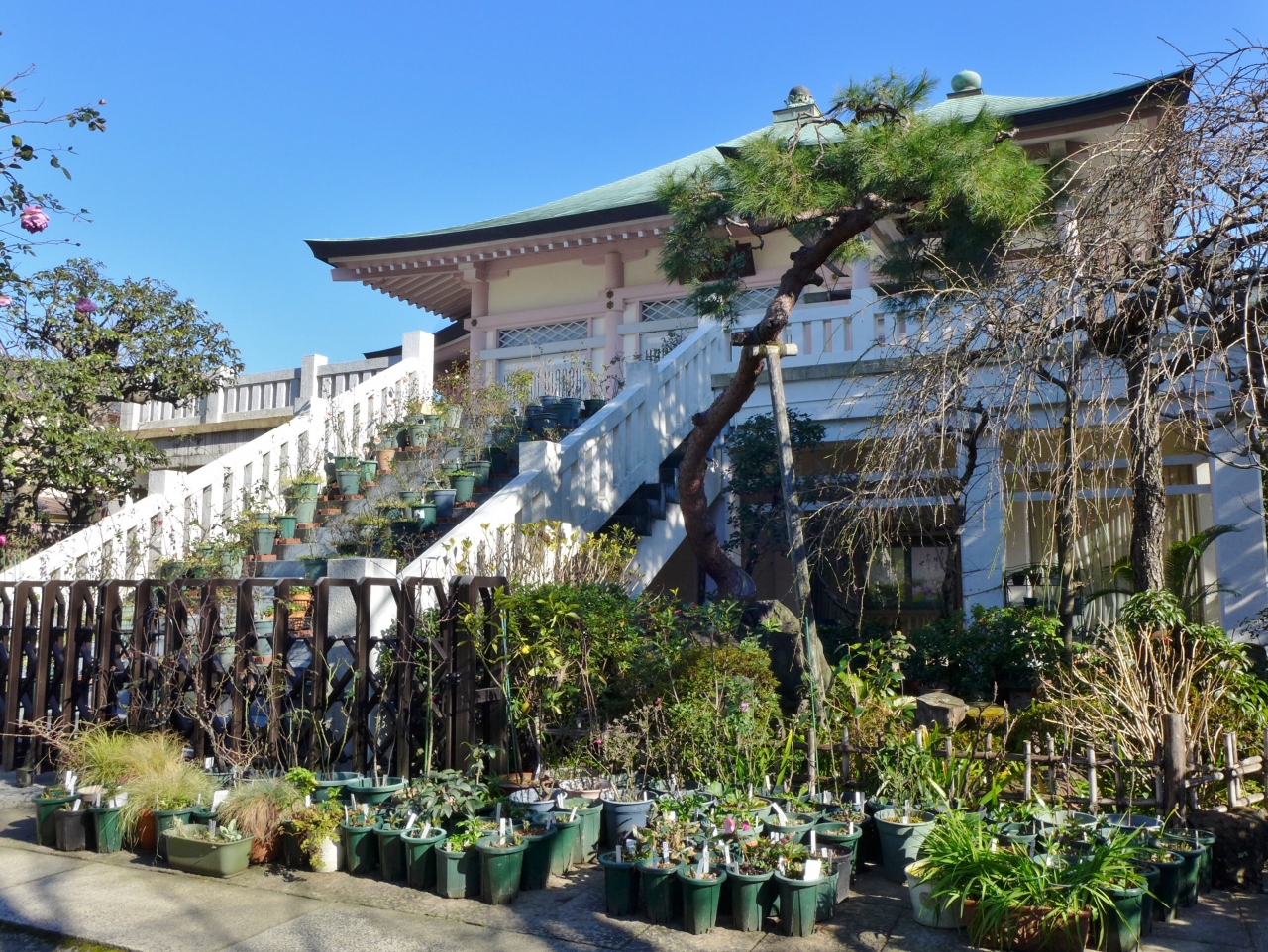 本堂への階段や日当たりの良い境内にはたくさんの植木鉢が並べられていました。