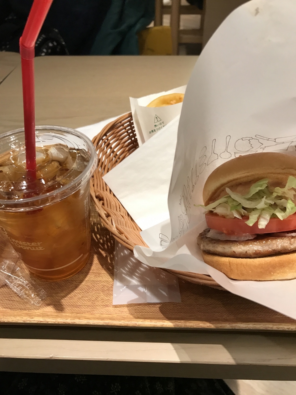関西空港にあるモスバーガーとミスタードーナッツが隣りにあります。本日は野菜モスバーガーとオニポテリングとアイスウーロン茶で810円。野菜モスバーガーはレタスとトマトたっぷり入ってオーロラソースが酸味があって美味しい。