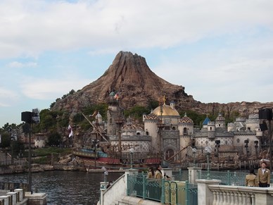 ディズニーシーの代名詞のような存在の火山です。火山じたいは中に入れず、アトラクションが中にあったり、この下が通路になっていたりします。設定上、火山ということもあり、火口は常に赤くなっており、時々大きな音とともに、火が噴きます。