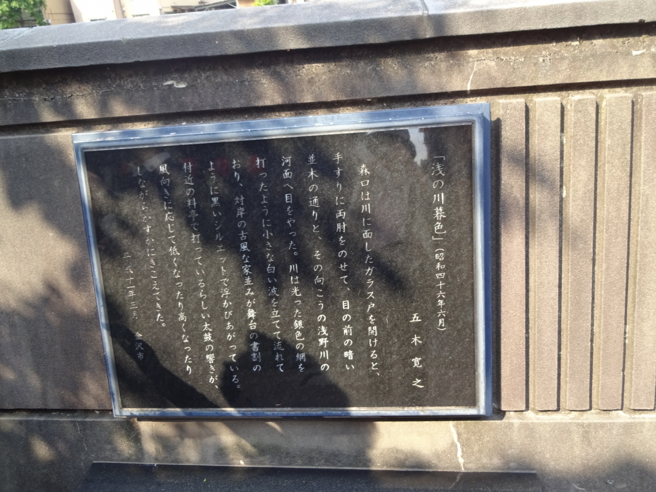 川に沿って「鏡花のみち」と名づけられた遊歩道があるのはこの近くで生まれ育った作家の泉鏡花にちなんでいる。