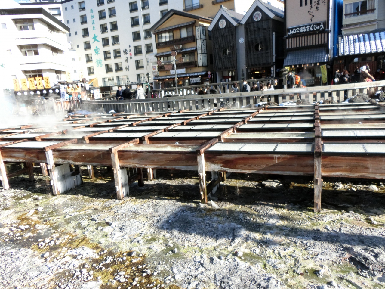 この湯畑で温泉の源泉を木製の樋に掛け流し、温泉の成分である湯の花の採取や湯温を調節しています。