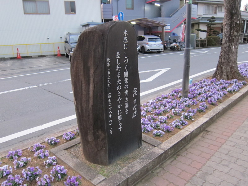 水の綺麗な街の散策は、歩いているだけで爽やかな気分になれますが、三嶋駅の南口にある白滝公園から三嶋大社に向かう桜川も綺麗な水が流れています。そして川沿いの歩道に、太宰治や若山牧水など、三島ゆかりの文学者12名の句碑が並び、ちょっとした文学気分の散歩が楽しめます。歩道にはところどころ花壇が置いてあり、色々な花が楽しめます。