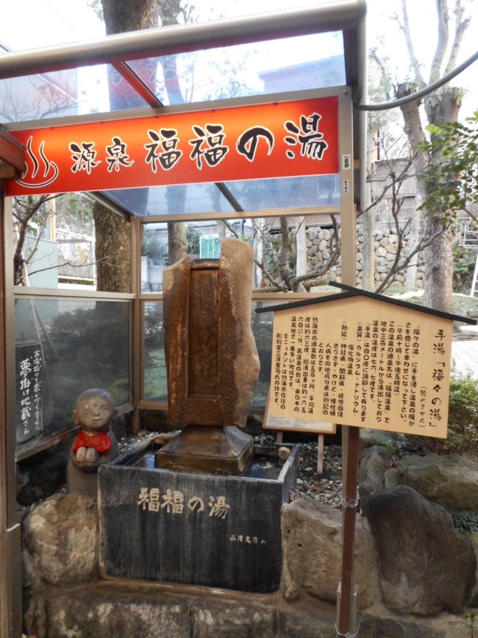 温泉地として有名な静岡の熱海温泉。その熱海駅からすぐの場所にあるアーケードを歩いていたら、この福福の湯ののぼりが見えましたので、ちょっと立ち寄ってみました。手湯ということで、温泉を手で楽しめる気軽な感じの施設になっていました。