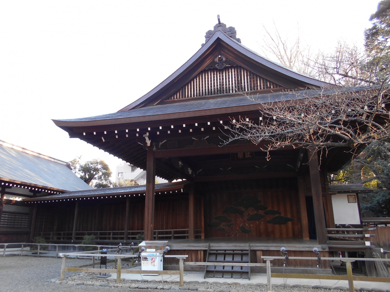 大きな鳥居をくぐってしばらく歩くと右手にあるのが「能楽堂」で、こちらは明治14年に東京の芝公園に建てられたものが移築されたそうです。